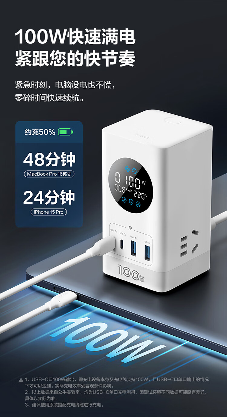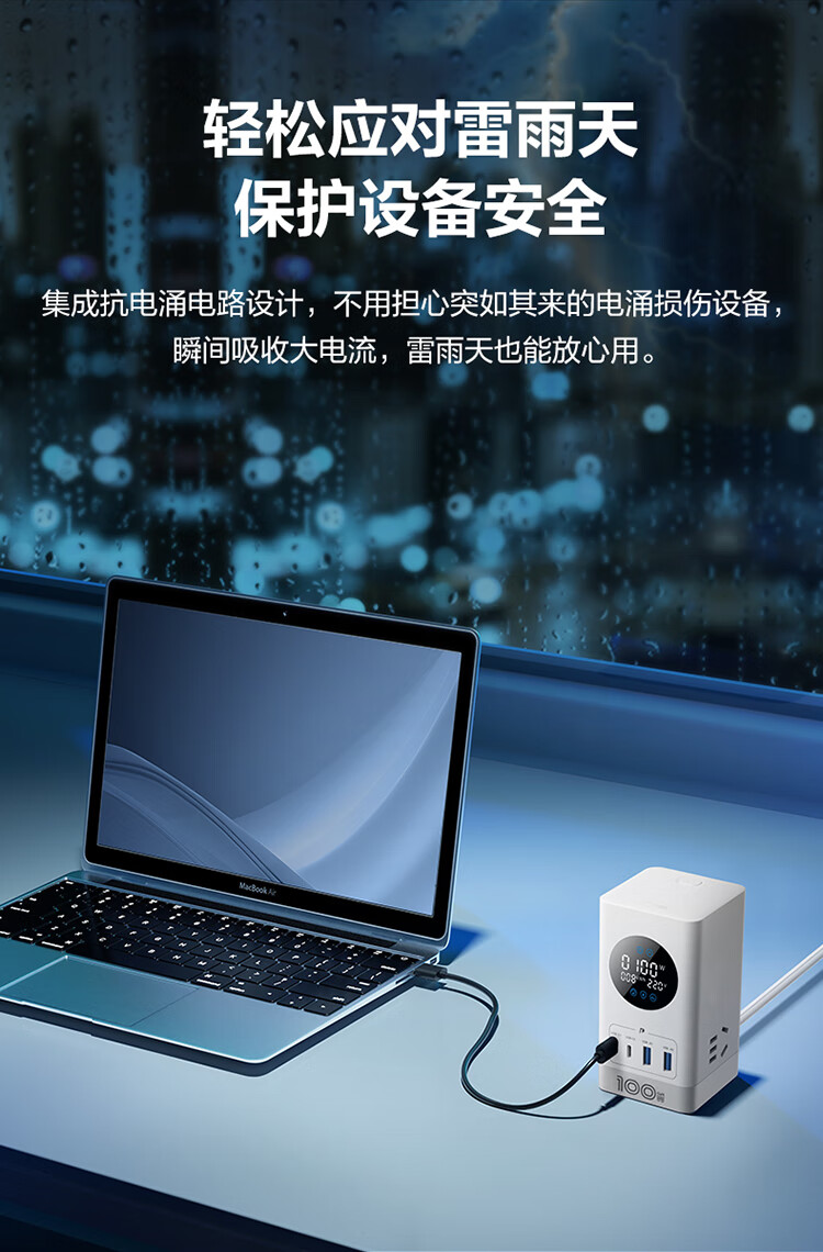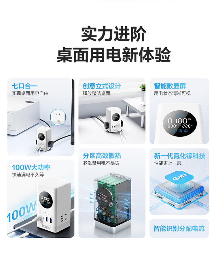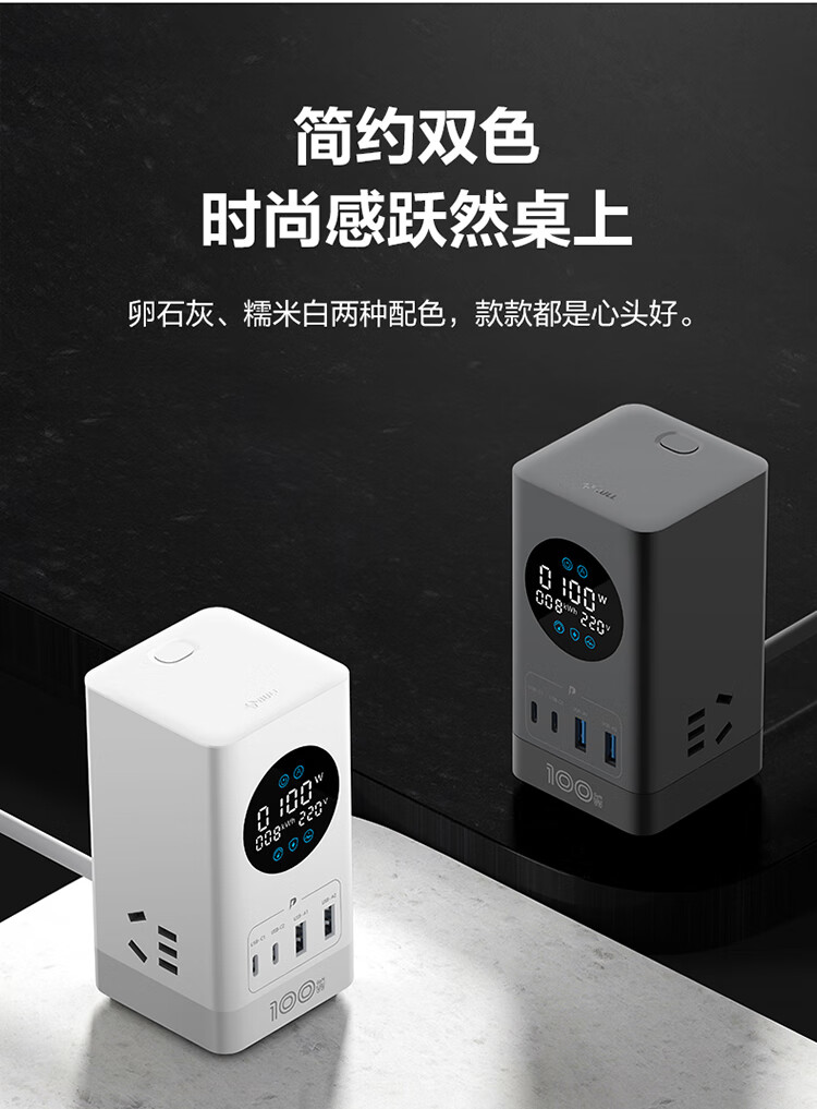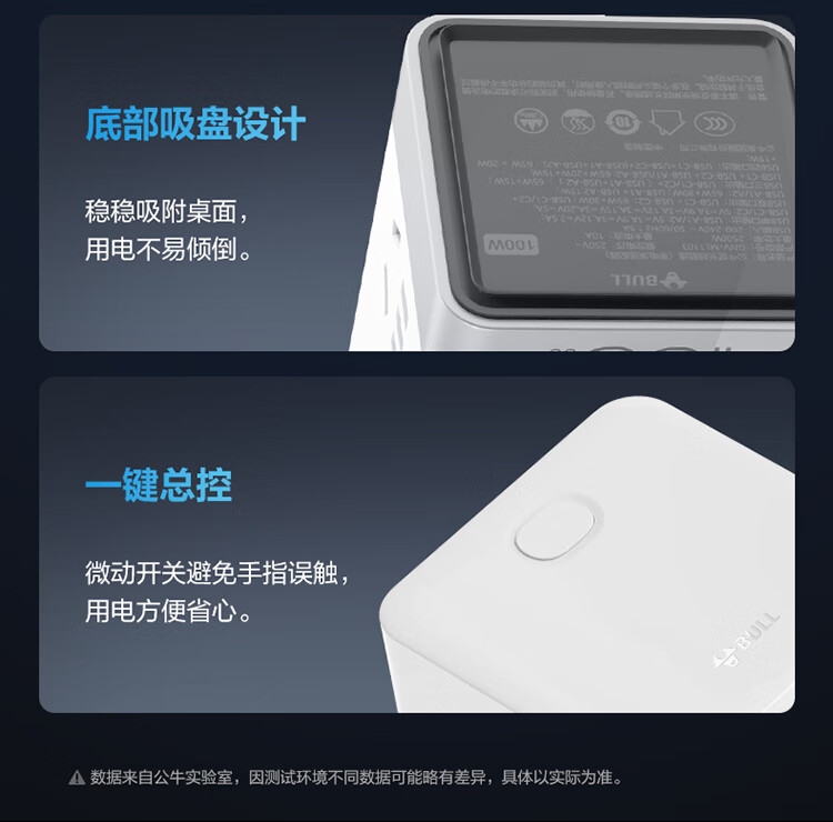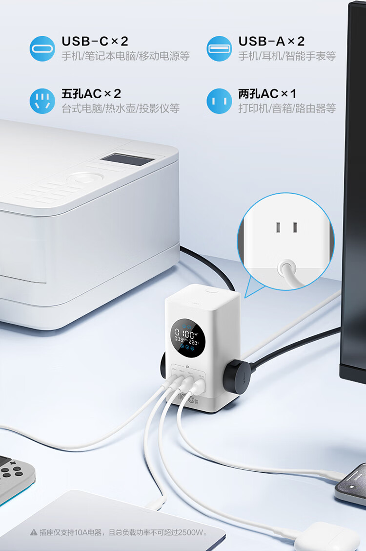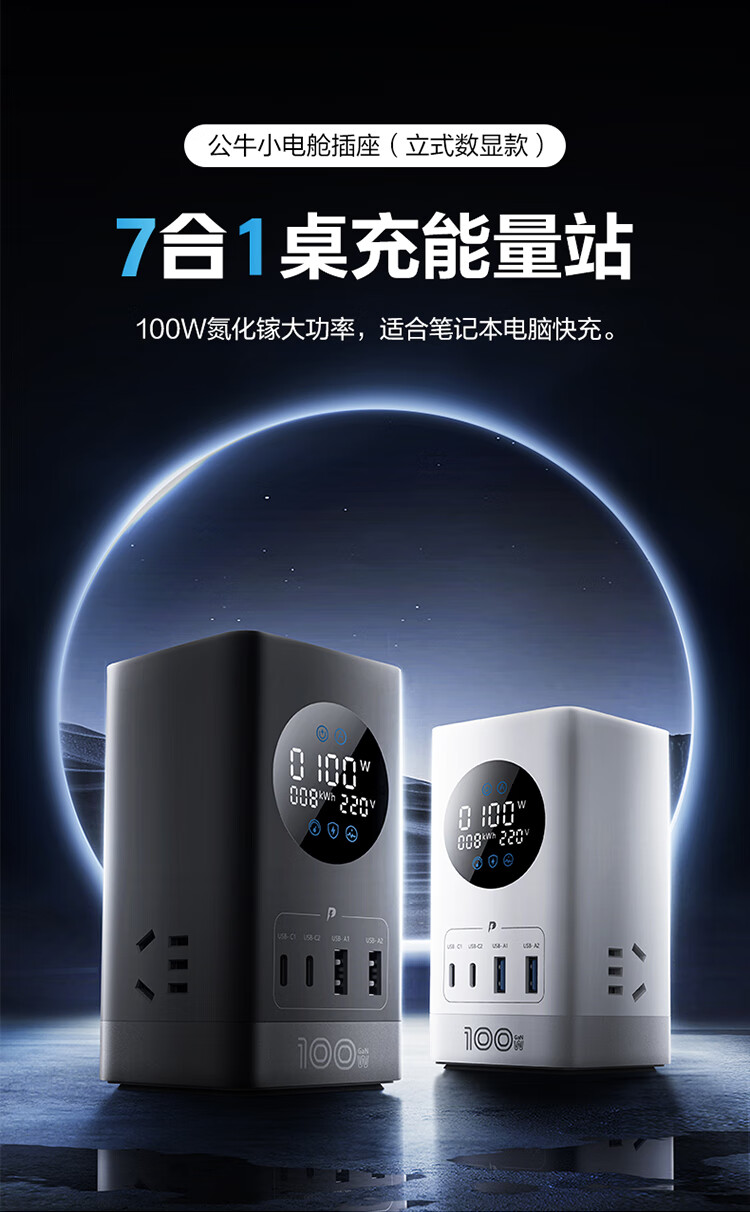 公牛(BULL)智能数显屏幕氮化镓100W快充插座/桌面充电站/桌面插座防雷抗电涌电竞USB立式小电舱 2C2A+3插孔 白1个