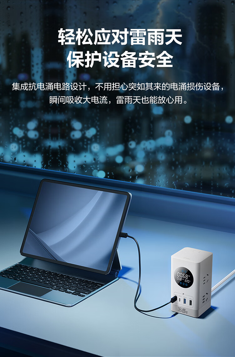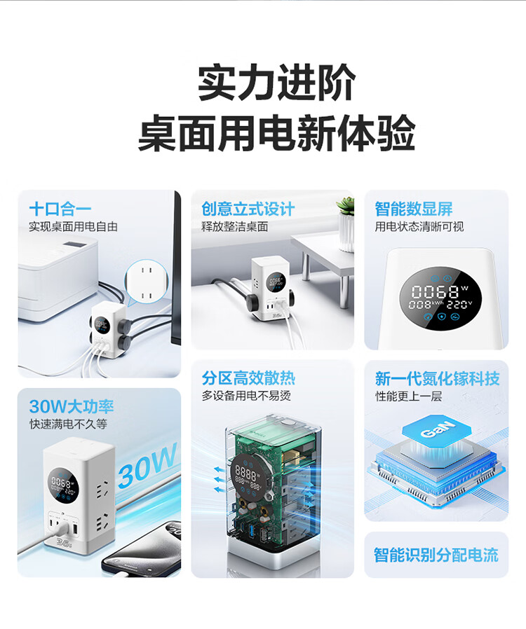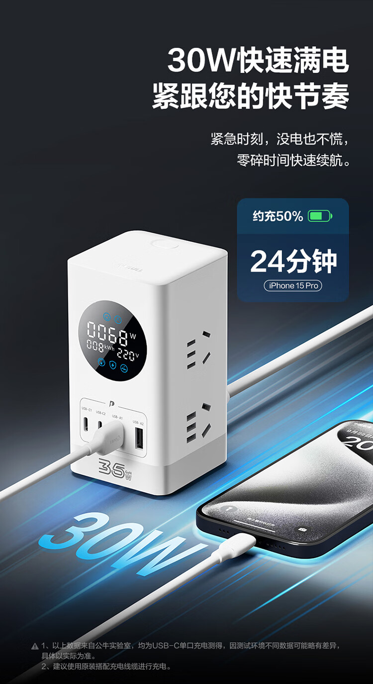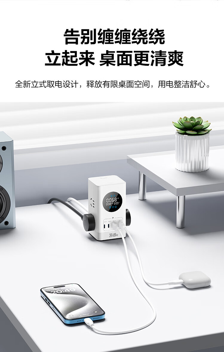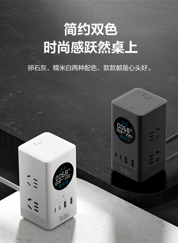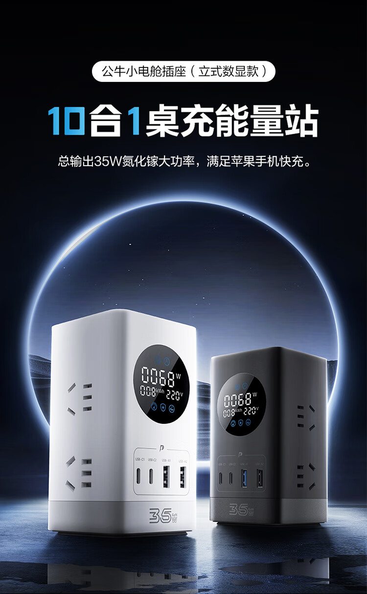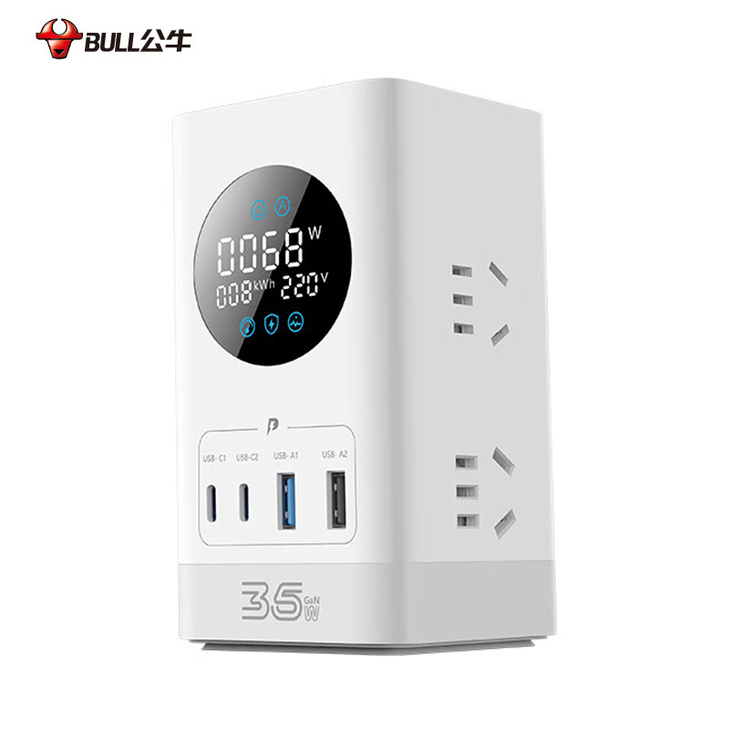 公牛(BULL)智能数显屏幕电竞氮化镓35W快充小电舱立式插座/多功能USB桌面笔记本插线板插排 2C2A+6插孔 白 1个