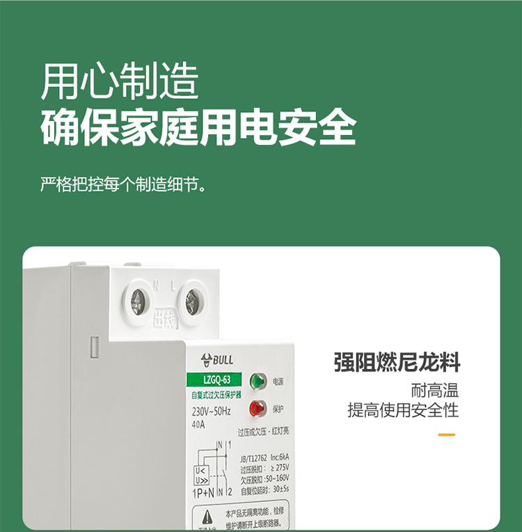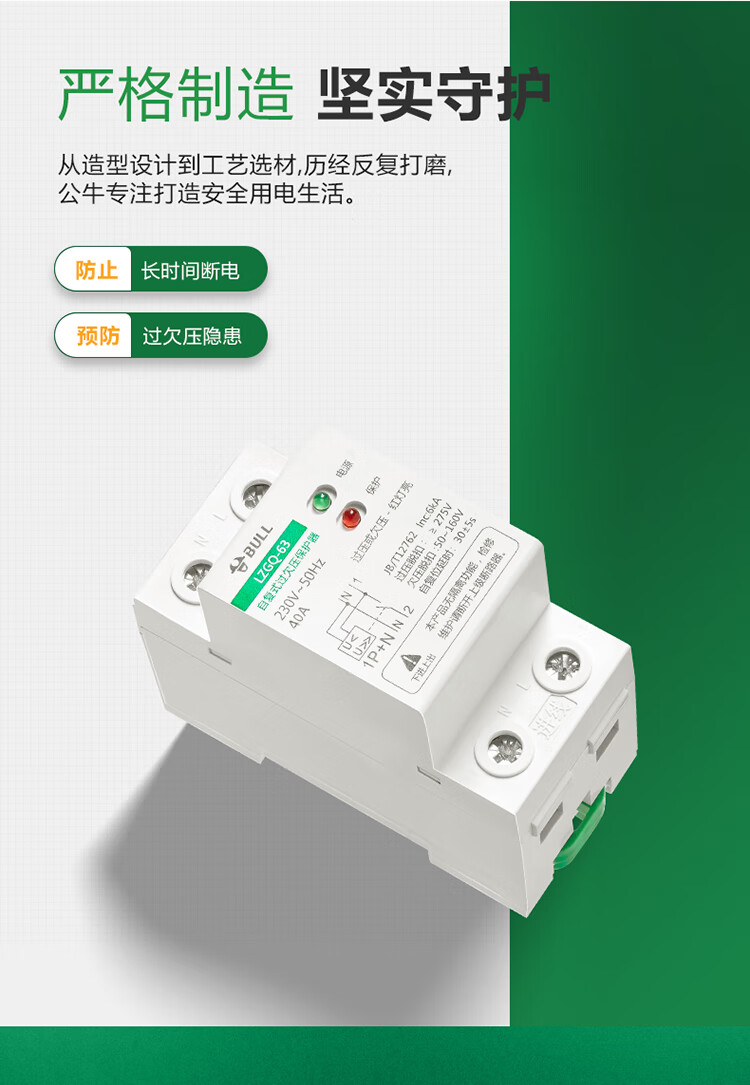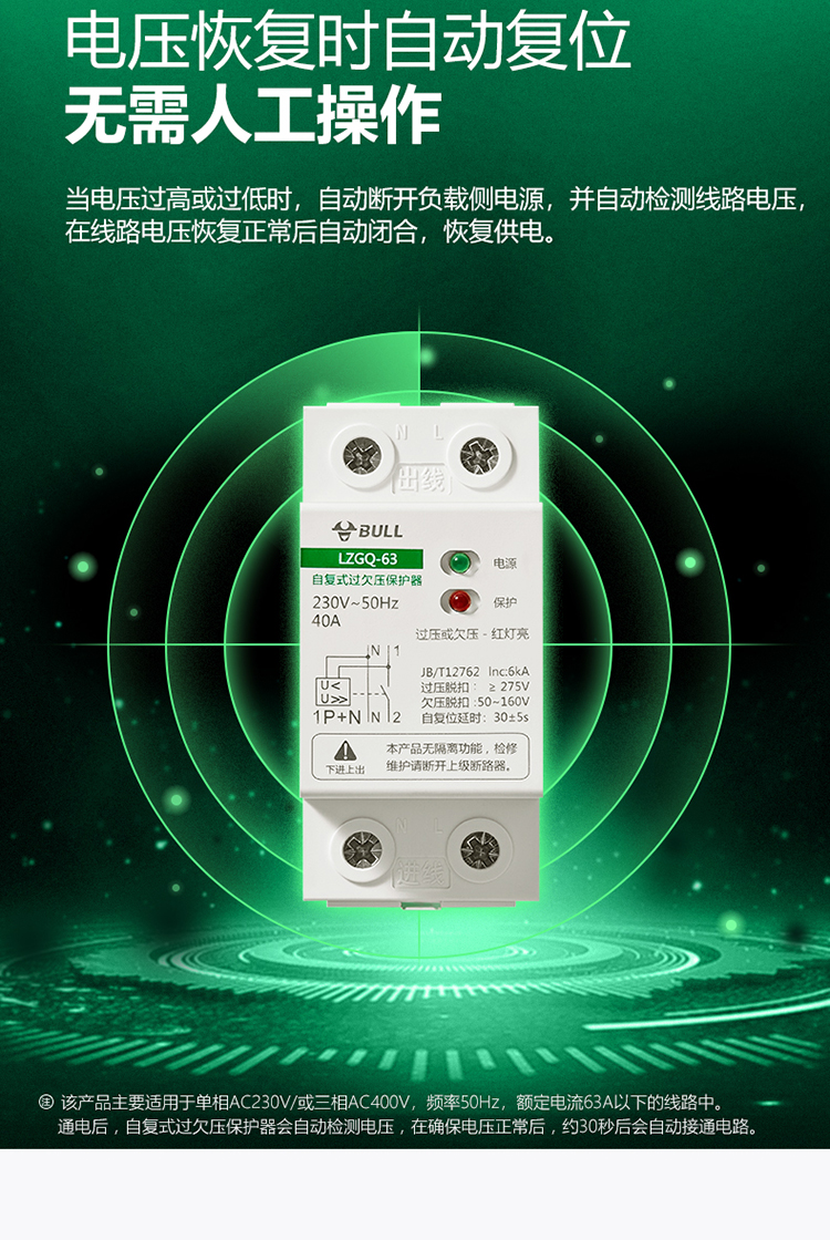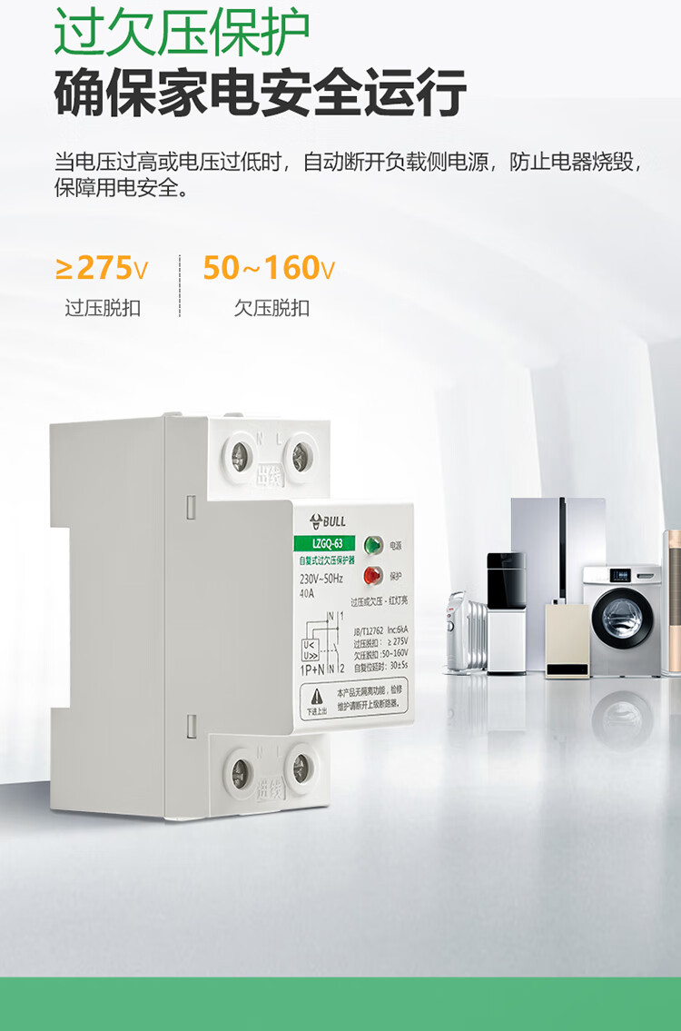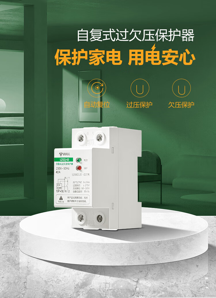公牛(BULL)空气开关 自复式过欠压保护器家用电源空开关LZGQ-63/1PN/63 1个