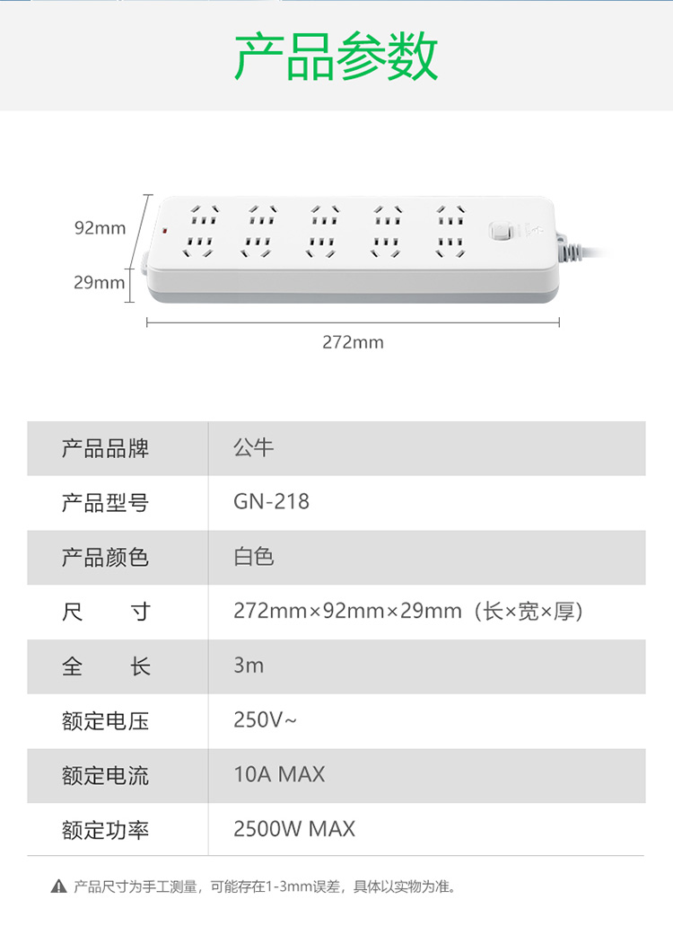 公牛 插线板 GN-218 10位总控全长3米 1个