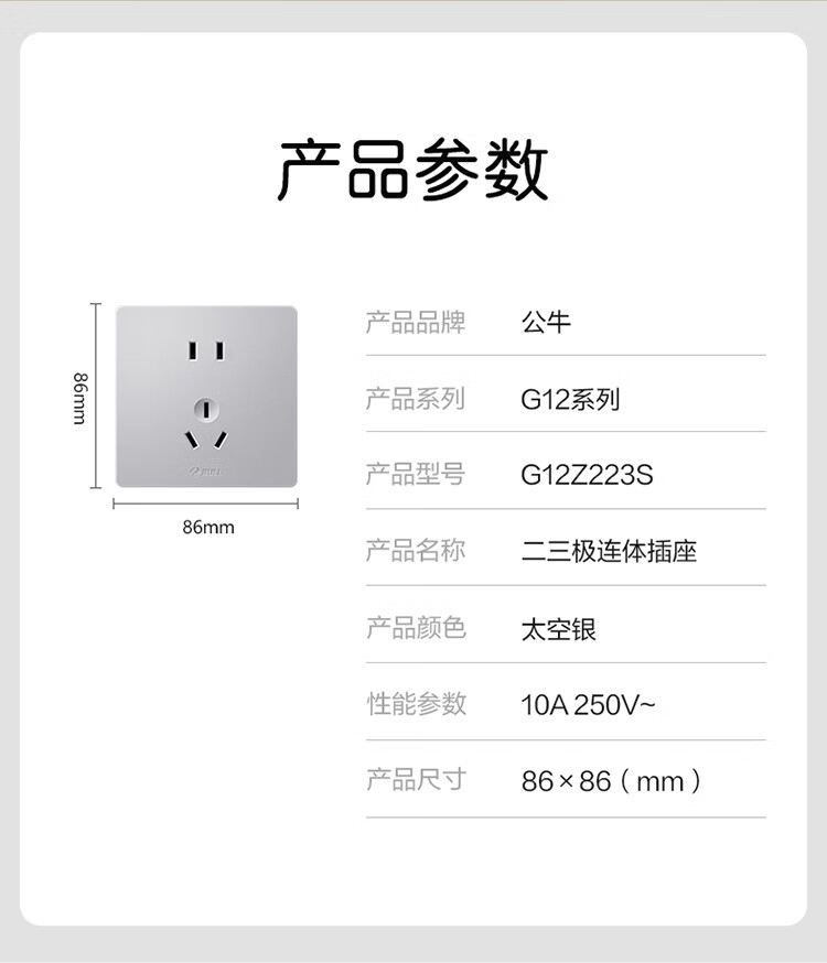 公牛 G12系列开关插座 G12Z223S 正五孔 太空银 10个 1件