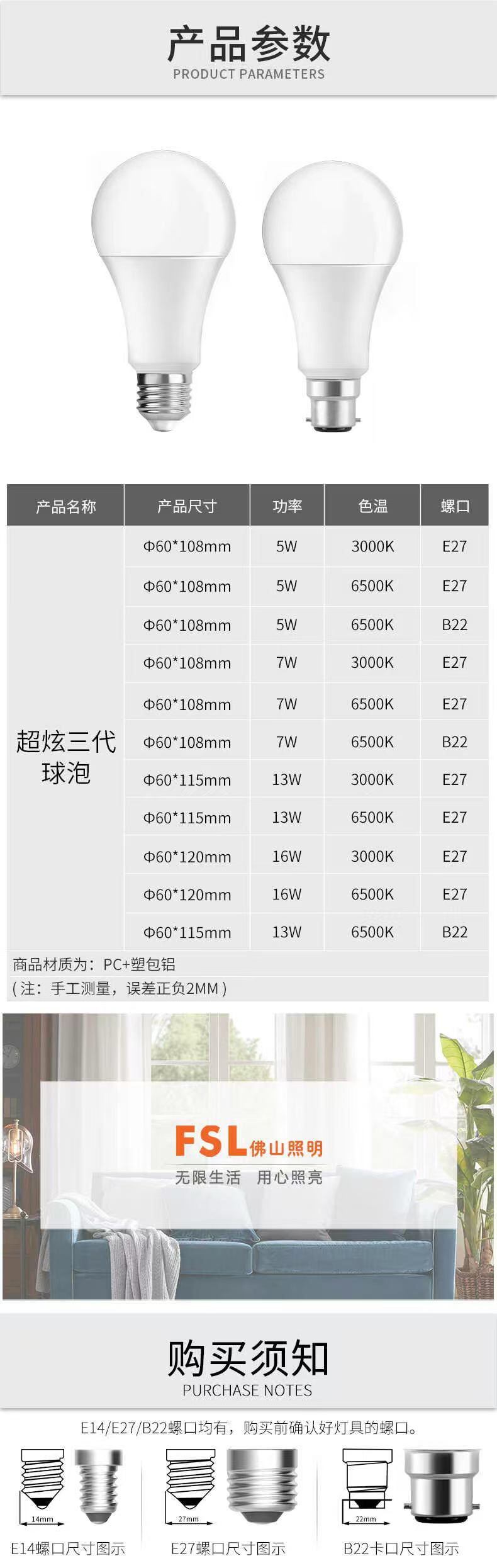 佛山照明 超炫Ⅲ代系列LED球泡灯 A60 E27 5W 白光 6500K 1只