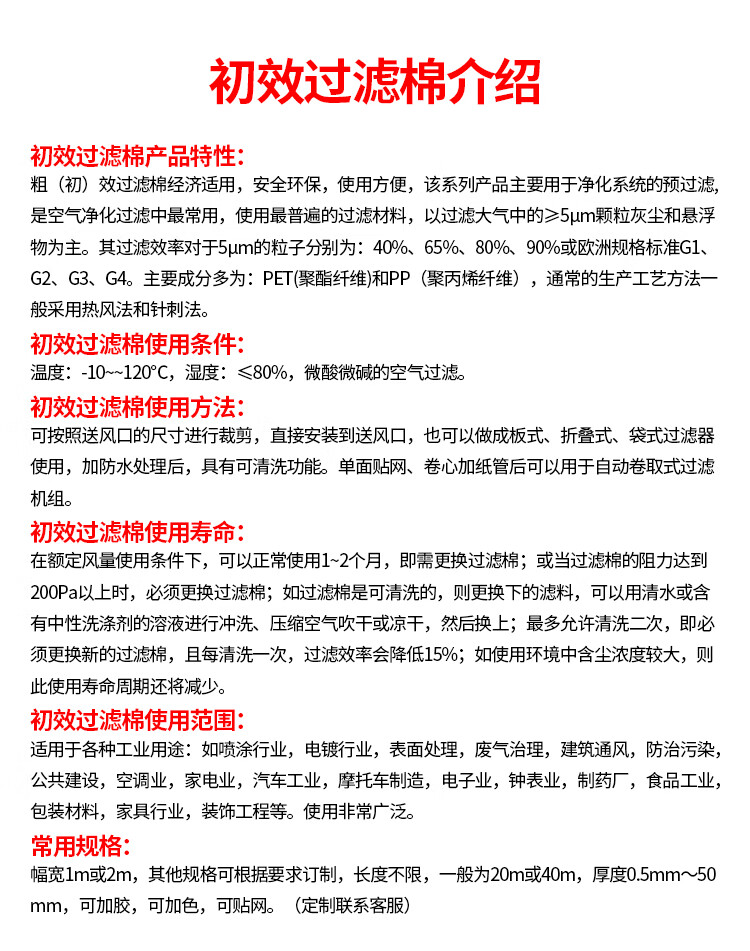 海斯迪克 初效过滤棉 hsxy312 1m×20m×5mm厚 1卷
