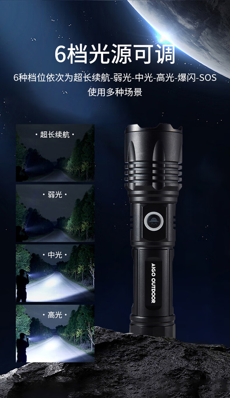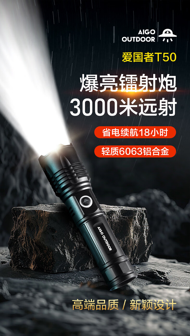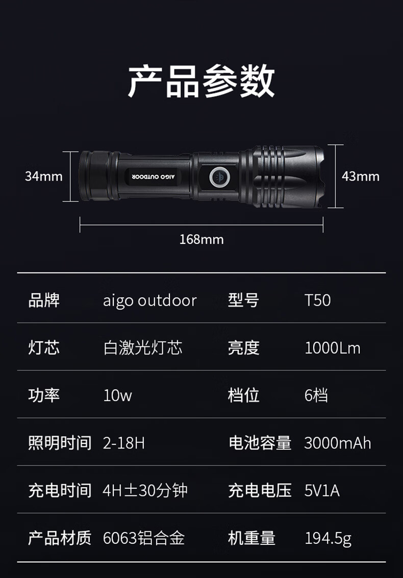 爱国者 强光手电筒 T50 10W 34*43*168mm 1个