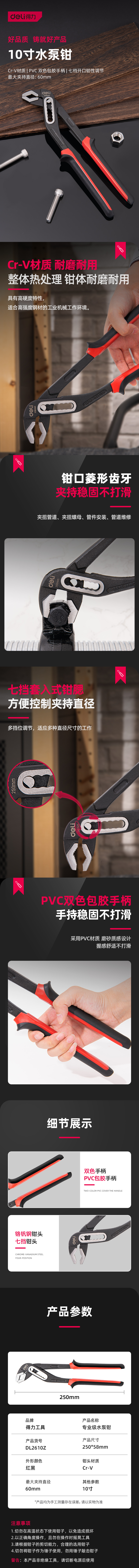 得力 专业级水泵钳 DL2610Z 红色 10寸 1把