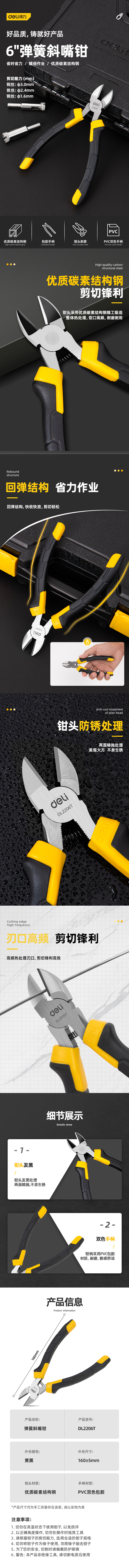 得力 德式斜嘴钳 DL2206T 黄色 碳素结构钢 6寸(带弹簧) 1把