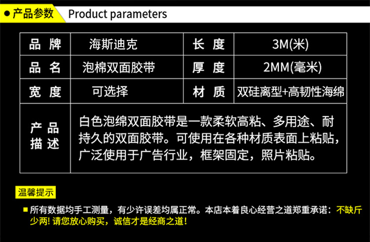 海斯迪克 双面胶泡沫胶带 H-90 白色 宽4.8cm*长3m 72卷 1箱