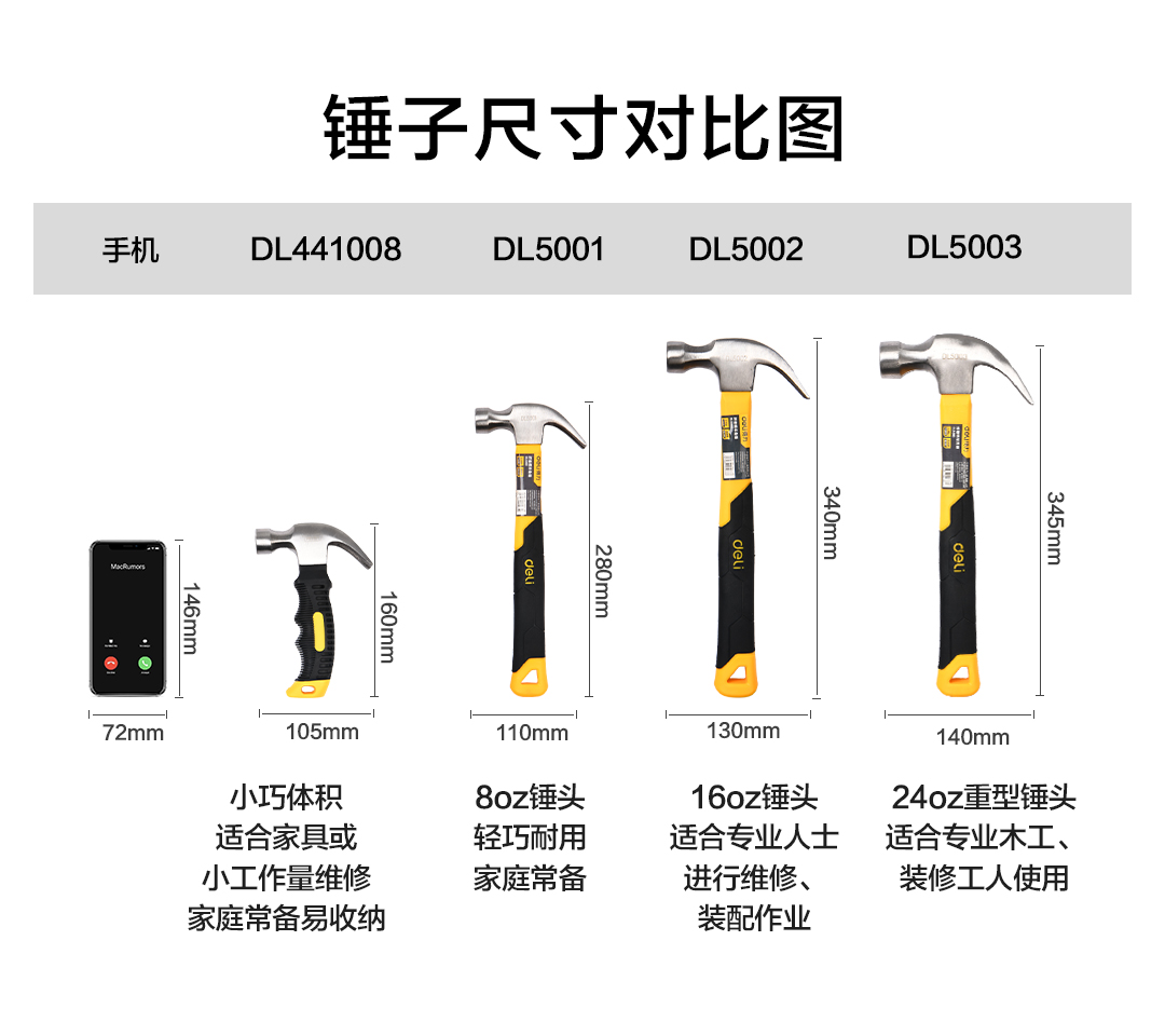 得力 纤维柄羊角锤 DL5003 黄色 优质钢 1.5lb 1把