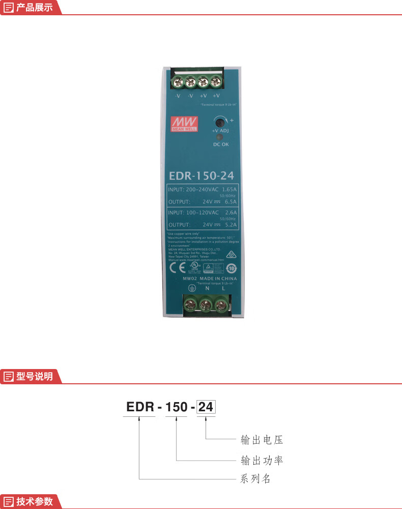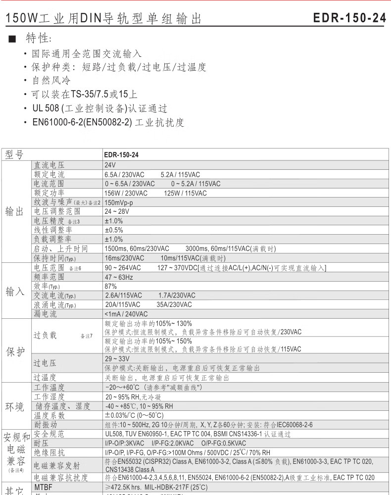 台湾明纬 开关电源 EDR-150-24 6.5A 1个