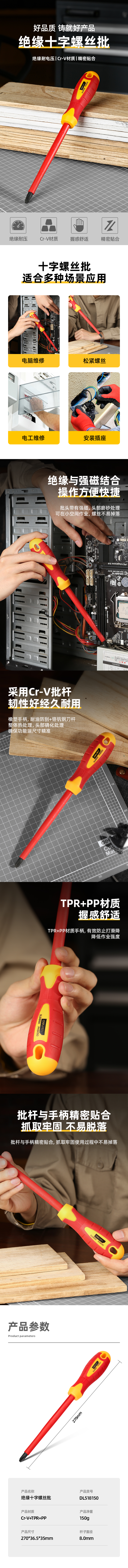 得力 绝缘十字螺丝批 DL518150 红色 PH3*150mm 1支