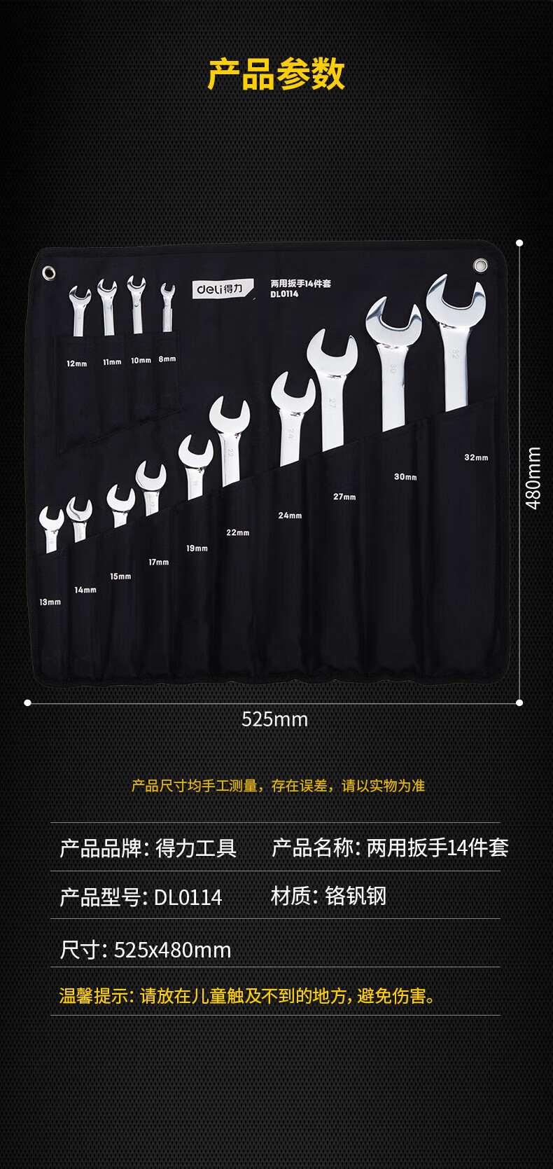 得力 镜面两用扳手套装 DL0114 银色 铬钒钢 布包 14件 1套