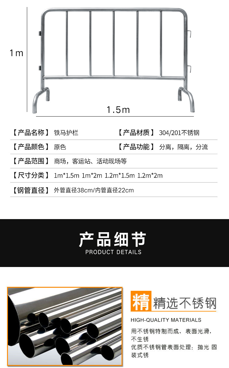 稳斯坦 铁马护栏 WST081 201不锈钢 1.2*2m 1个