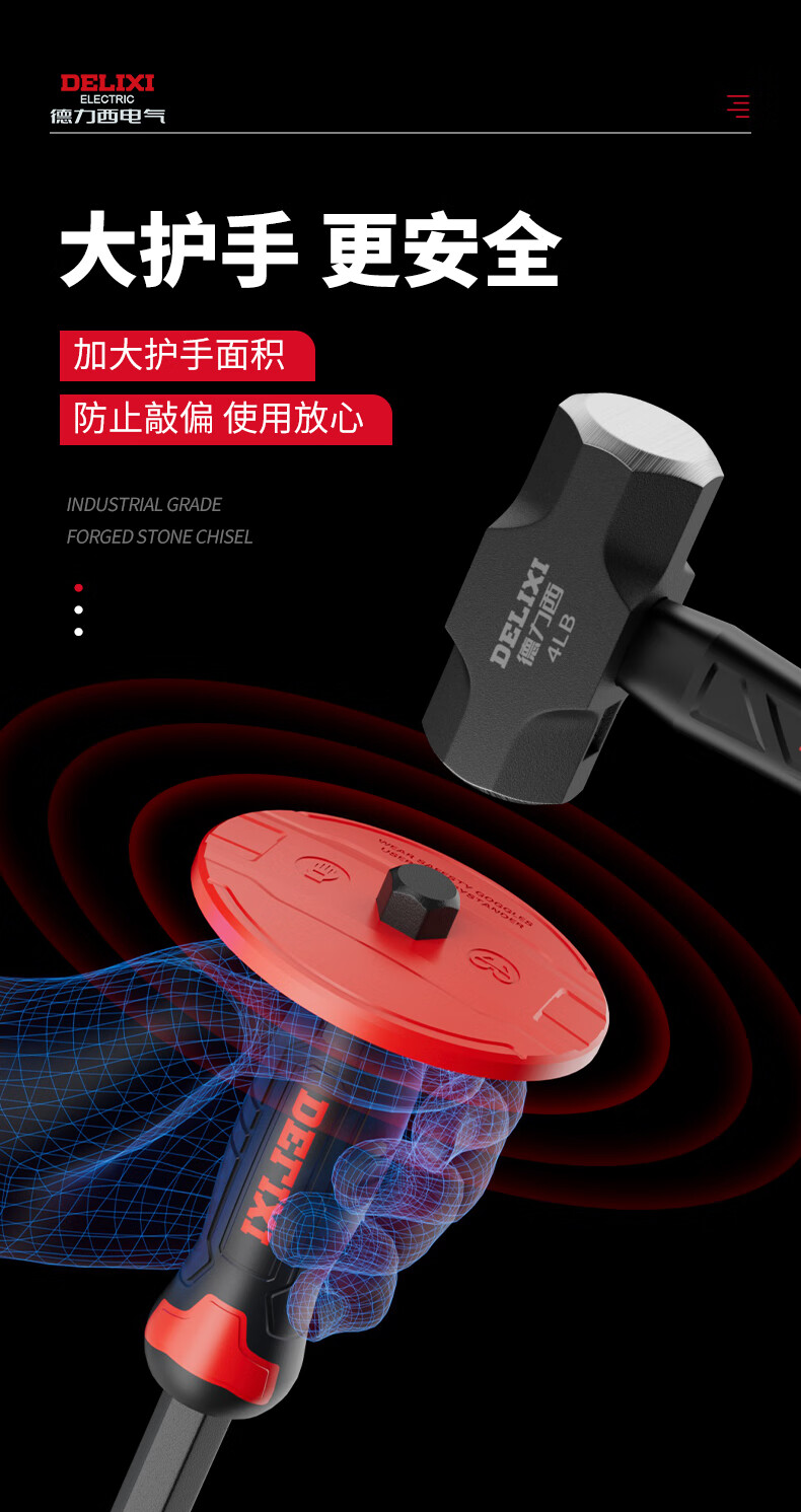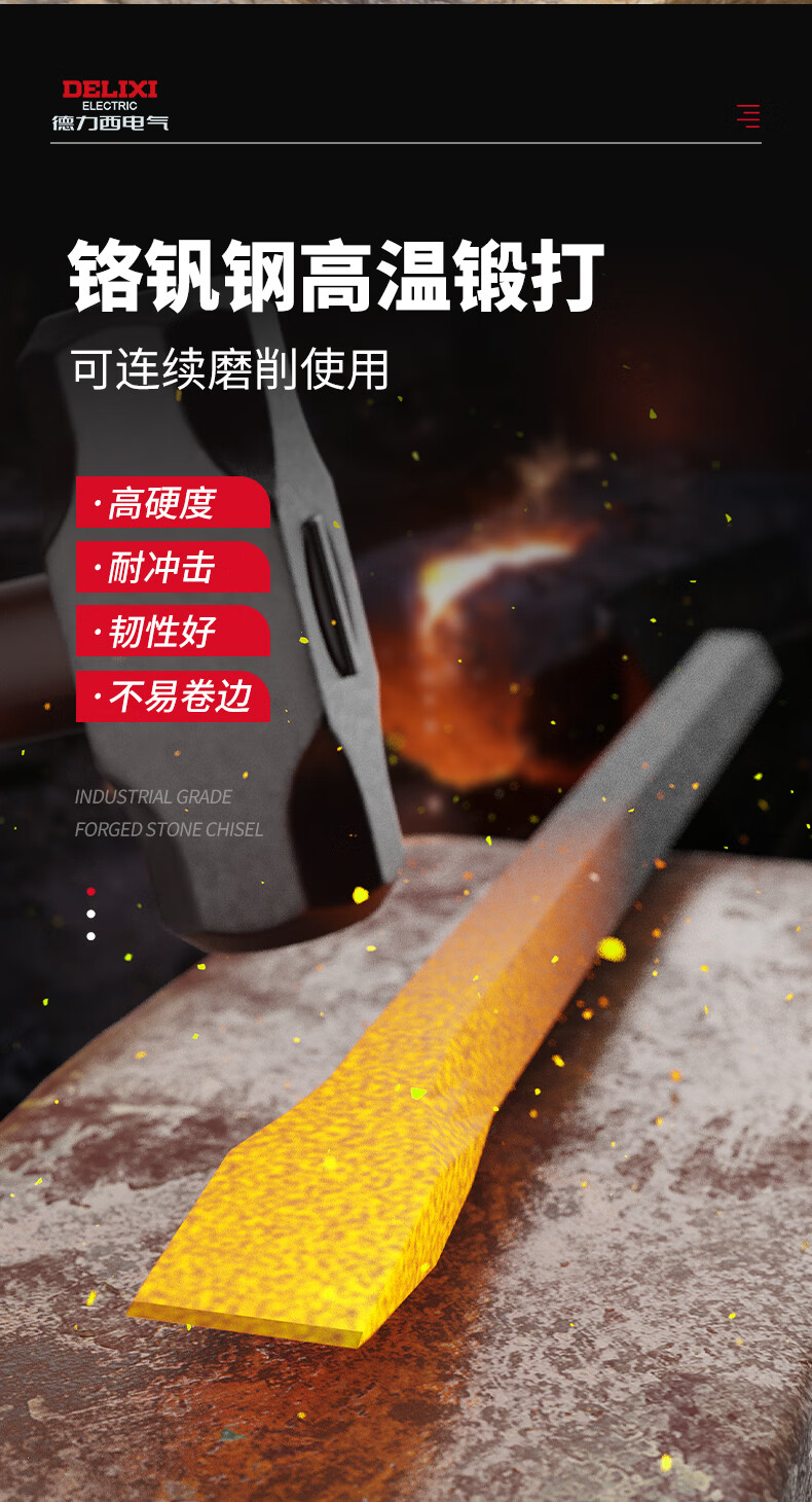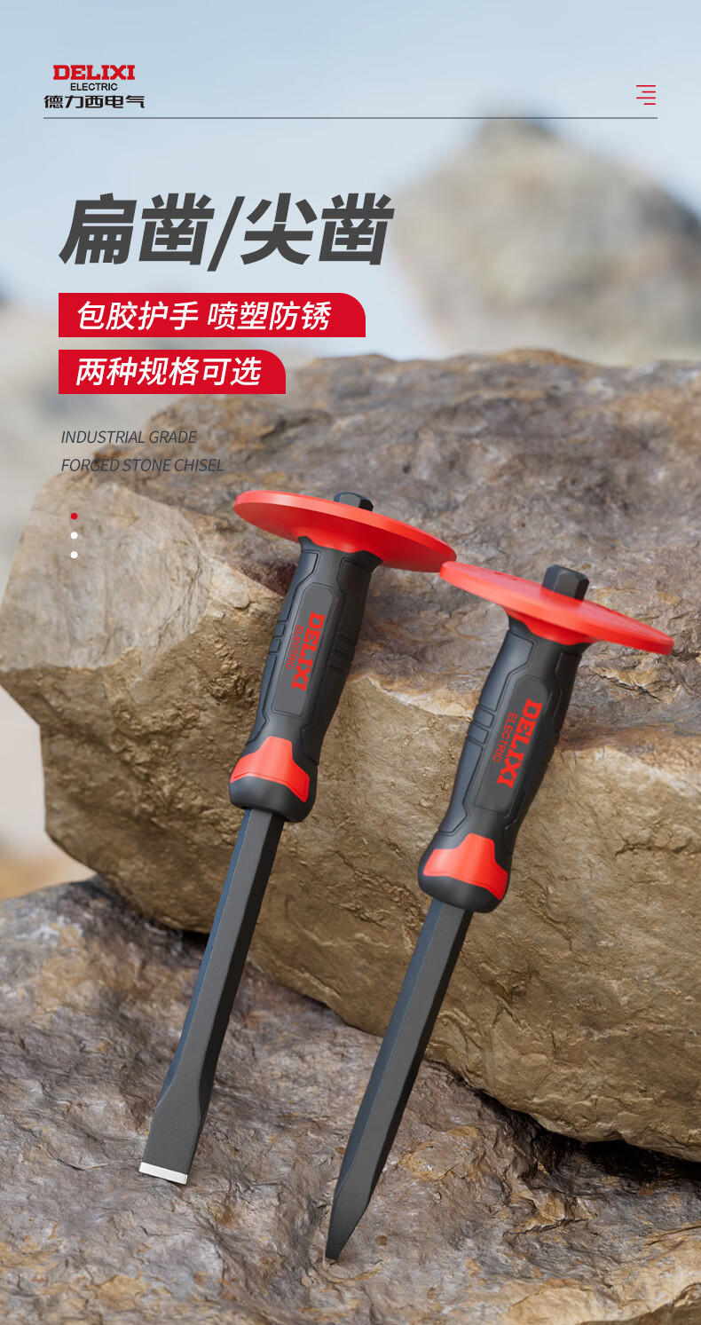 德力西电气 铬钒钢尖头石工凿 12寸扁凿+12寸尖凿+一磅防震八角锤 3把 1套