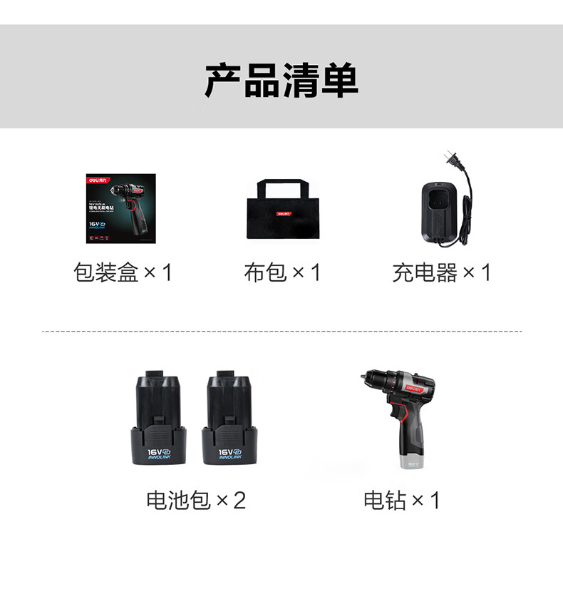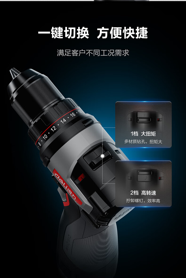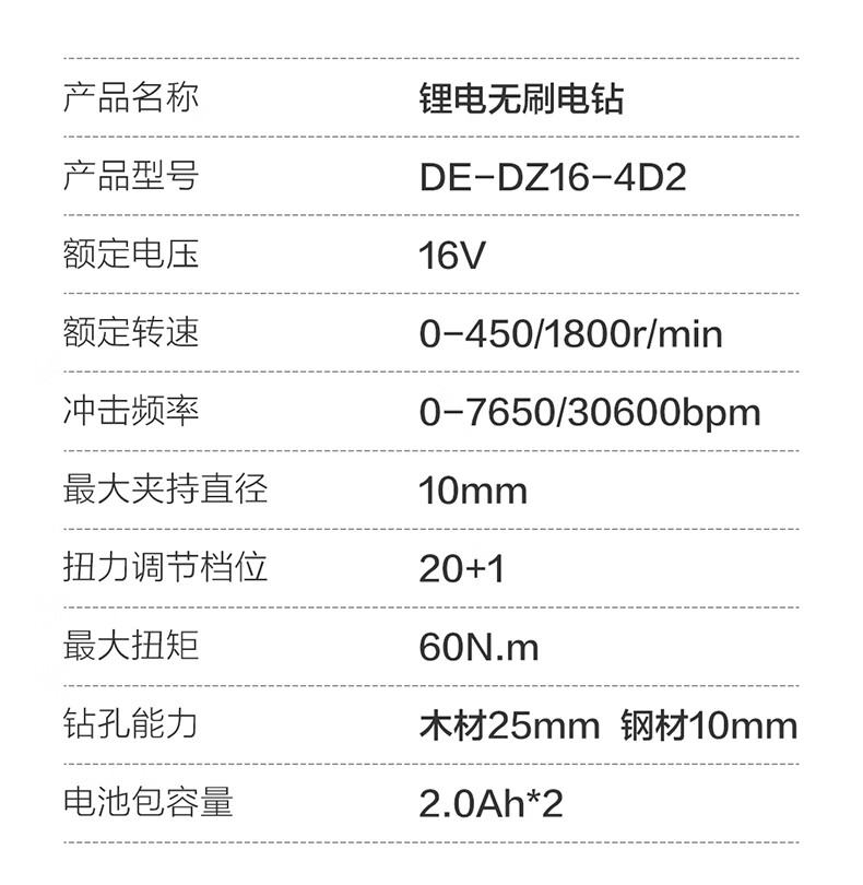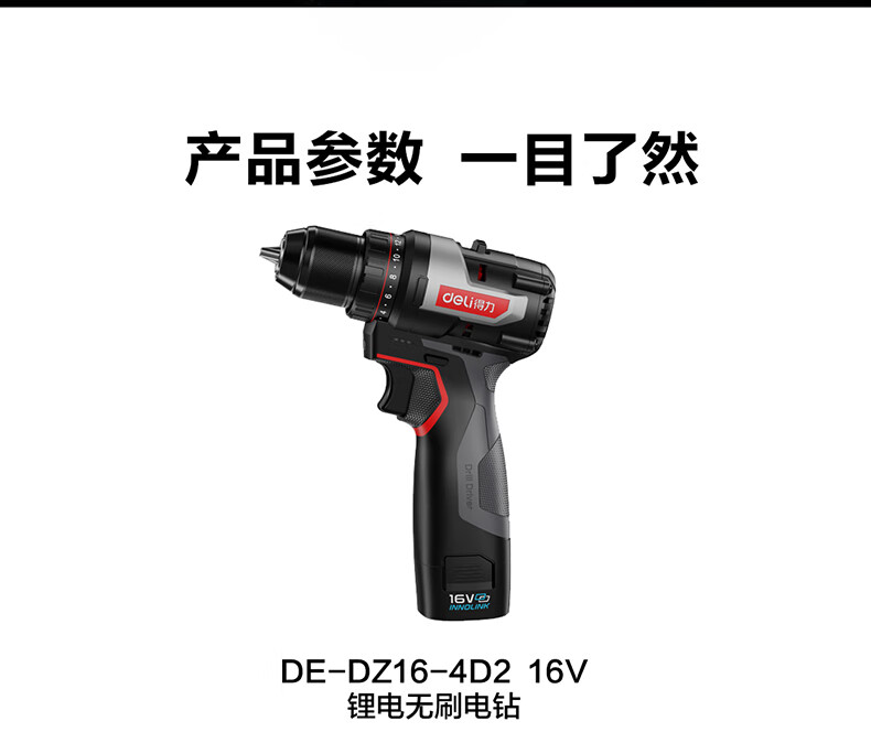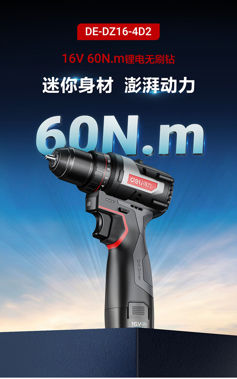 得力 电钻 DE-DZ16-4D2 16V 60N.m 双电2.0Ah 1把