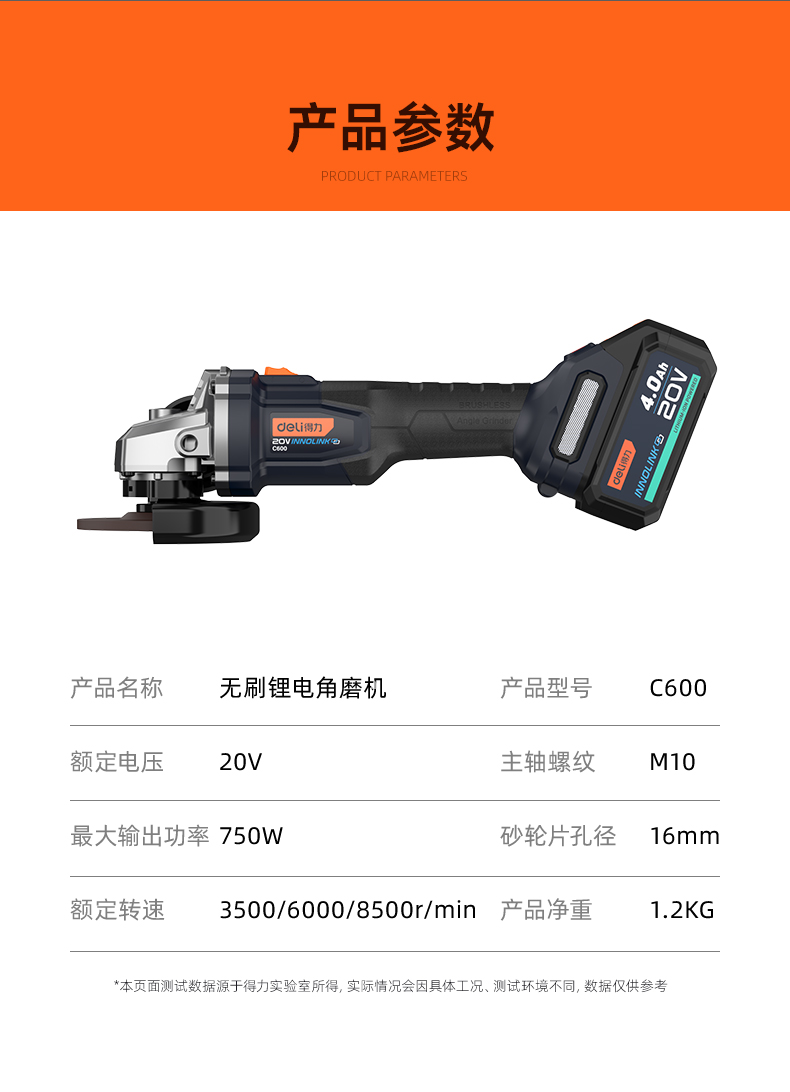 得力 角磨机 C600 20V 最大磨片直径100mm 4Ah双电 1台