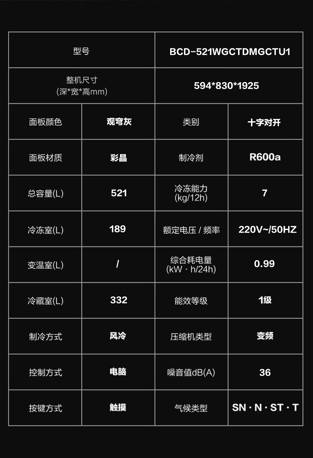 卡萨帝 冰箱 BCD-521WGCTDMGCTU1 一级能效 830mm*594mm*1925m 1台