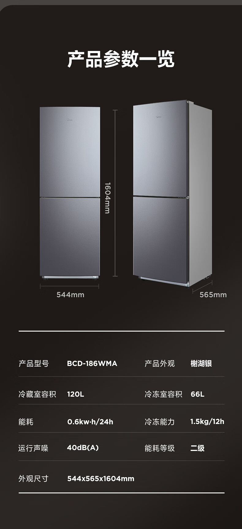 美的 双开门冰箱 BCD-186WMA 银色 186L 二级 1604×544mm 1台