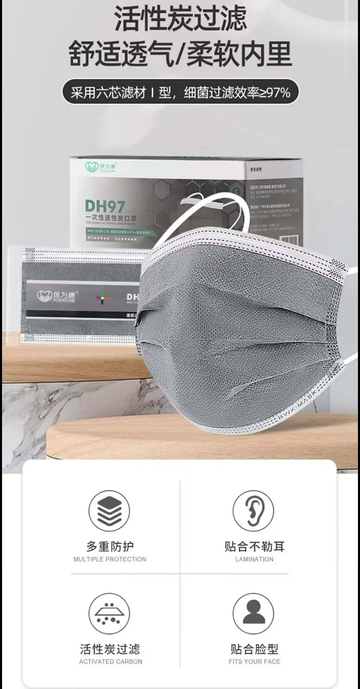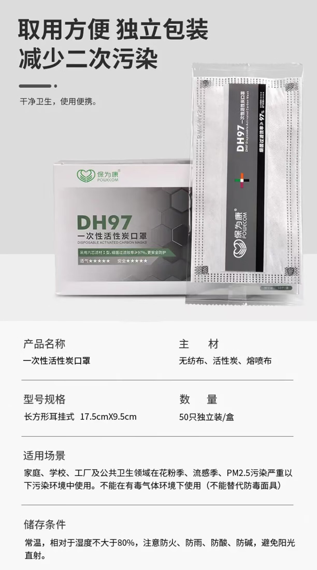 保为康 一次性活性炭口罩 DH97 耳戴式 50片 1盒