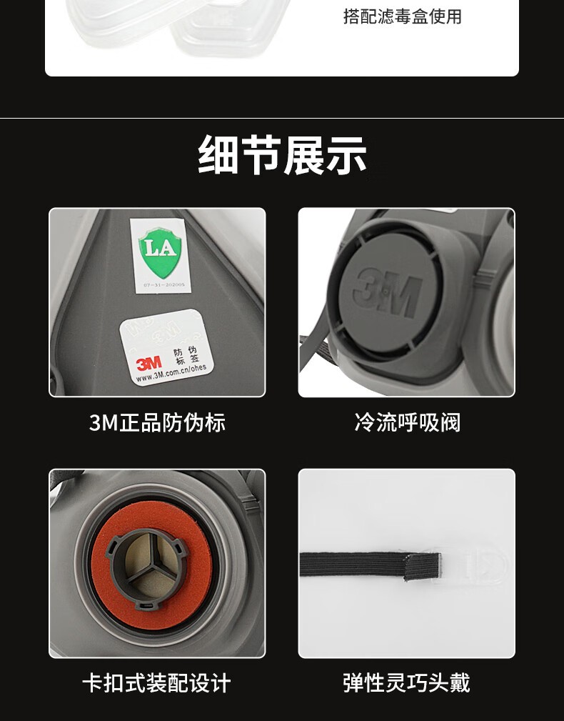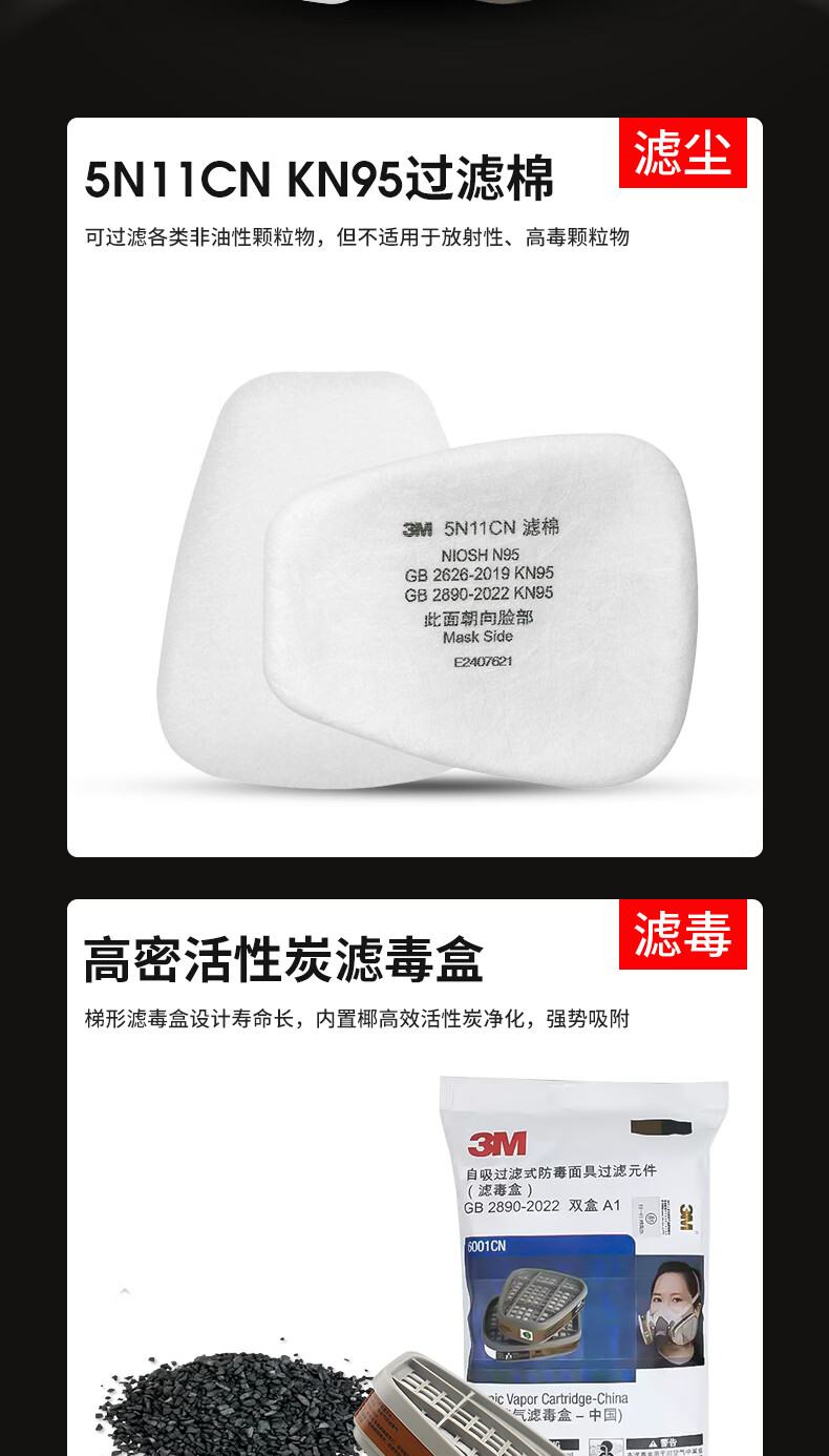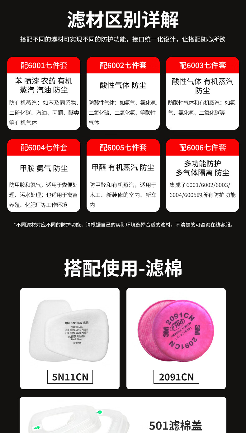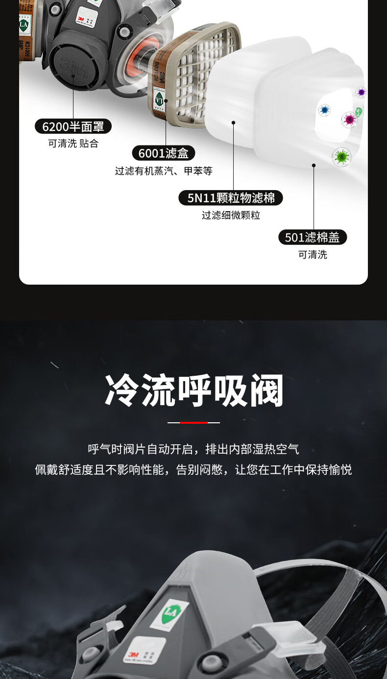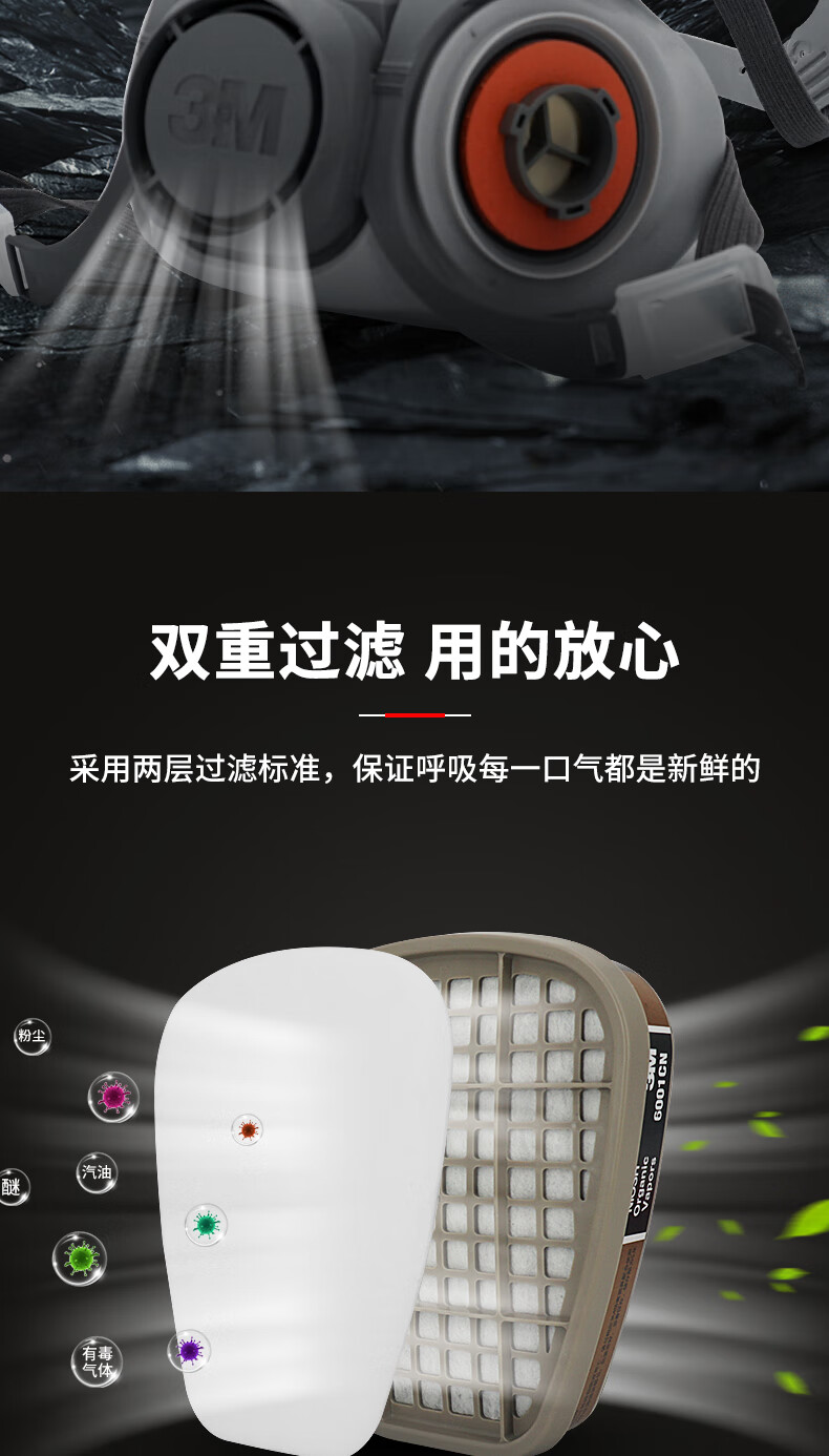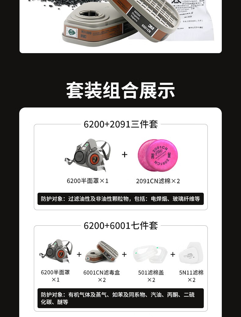3M 防毒面罩套装 6200+6001 半面罩+滤毒盒*2+滤棉盖*2+滤棉*2 7件 1套
