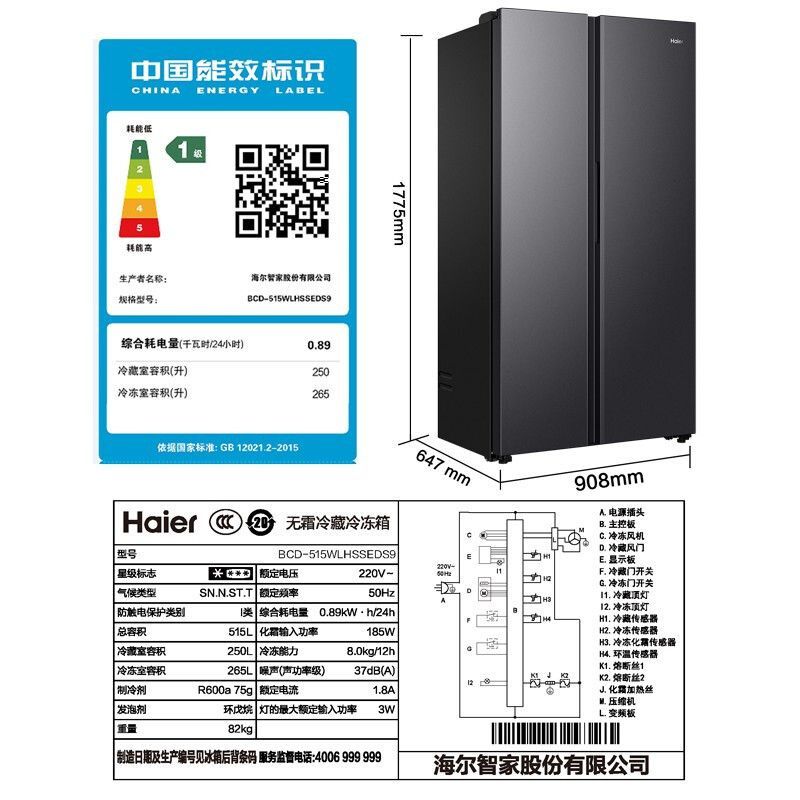 海尔 冰箱 BCD-515WLHSSEDS9 515L 908×647×1775mm 1台