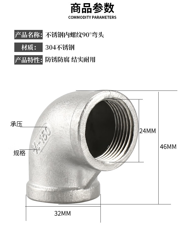 • 商品名称:海斯迪克 304不锈钢内丝弯头