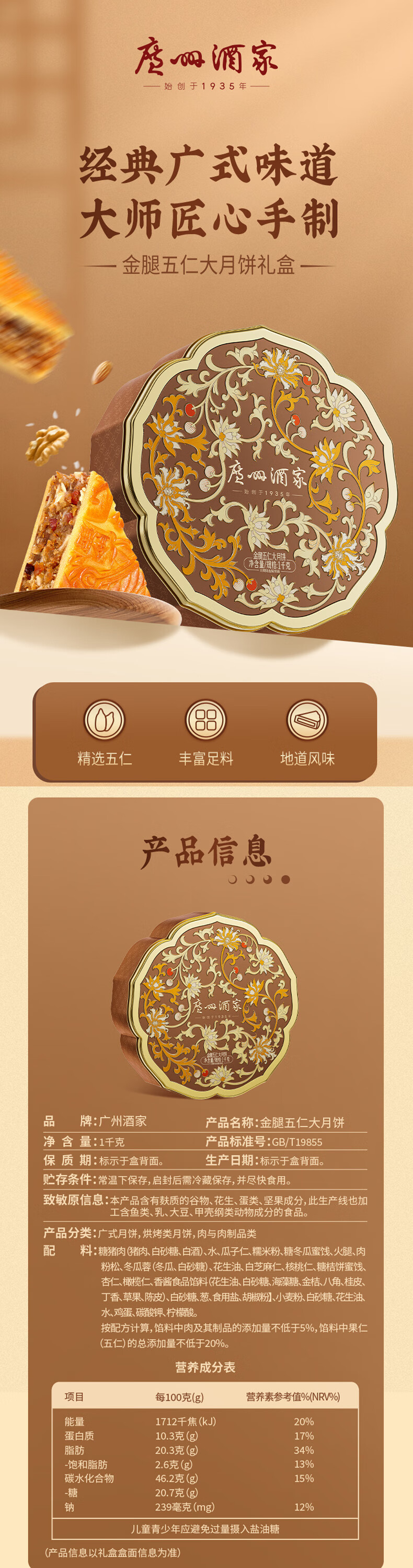 广州酒家 金腿五仁大月饼 1000g 1盒