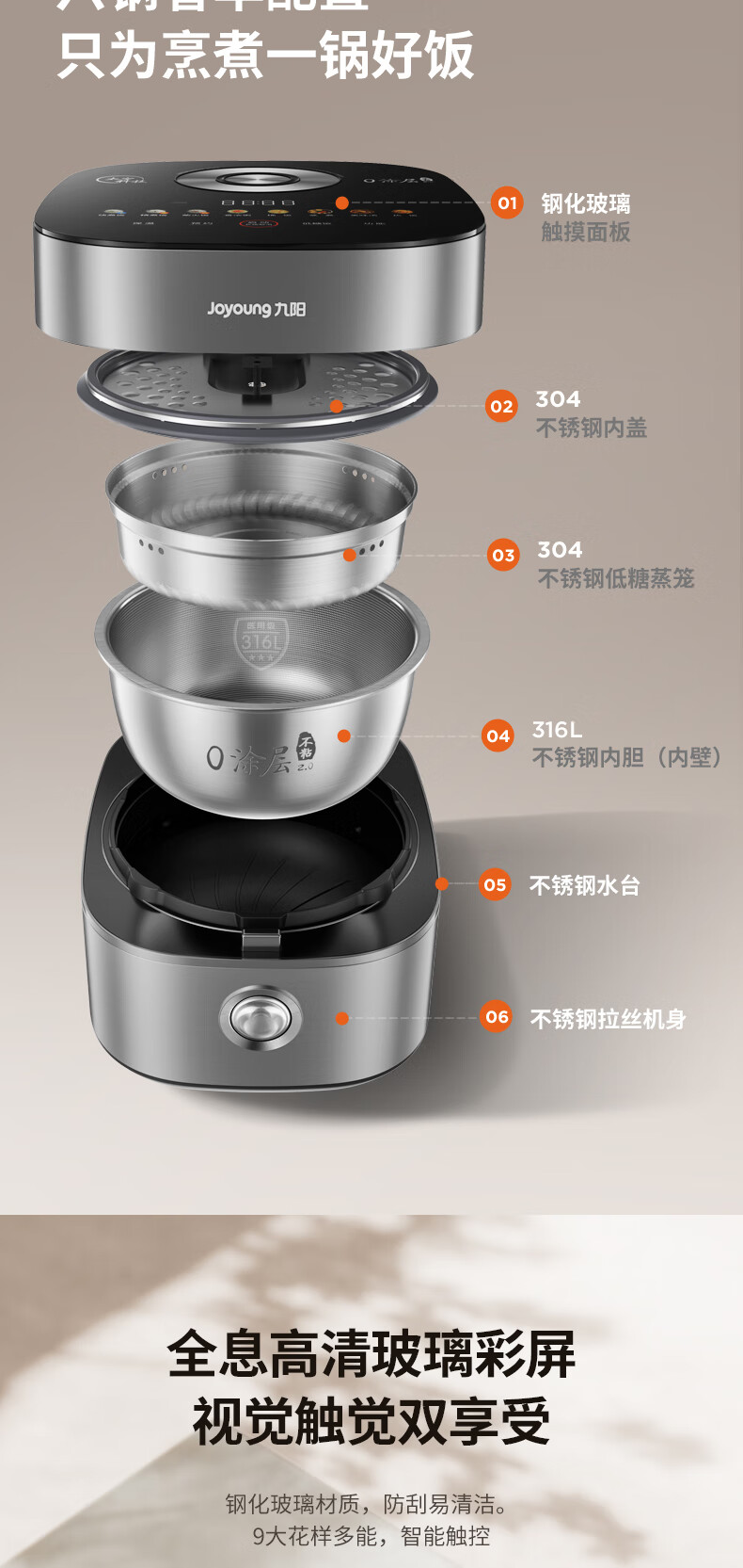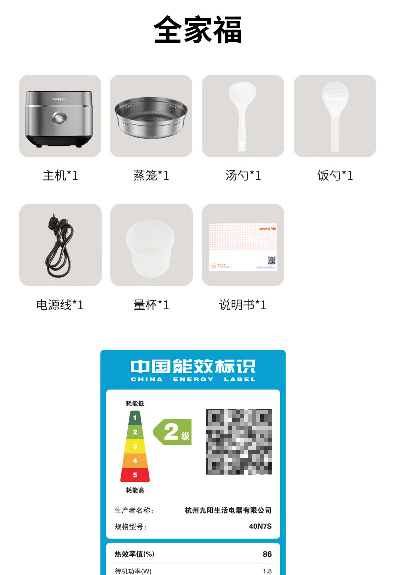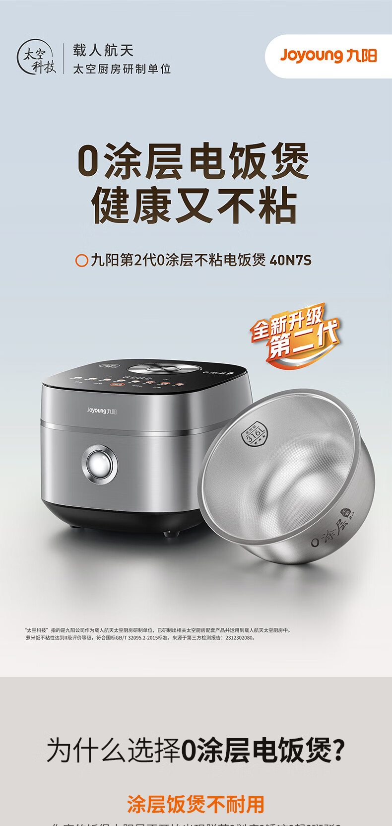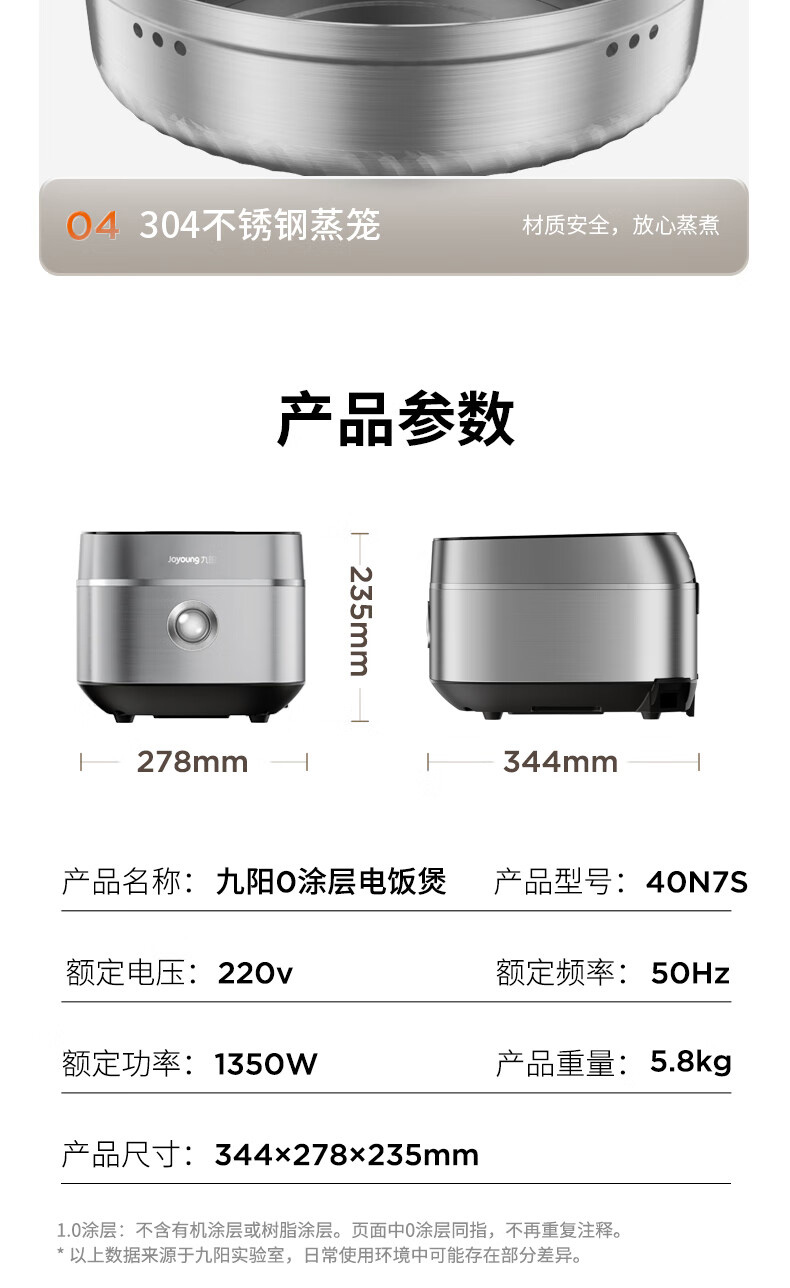 九阳 316L不锈钢0涂层电饭煲 40N7S 4L 1350W 1个