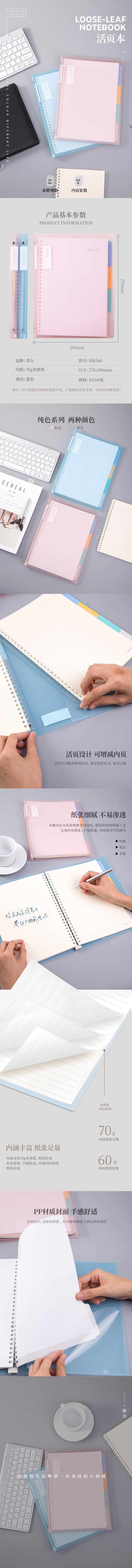 得力 活页笔记本 HB560 蓝色 浅调 B5 60页 1本