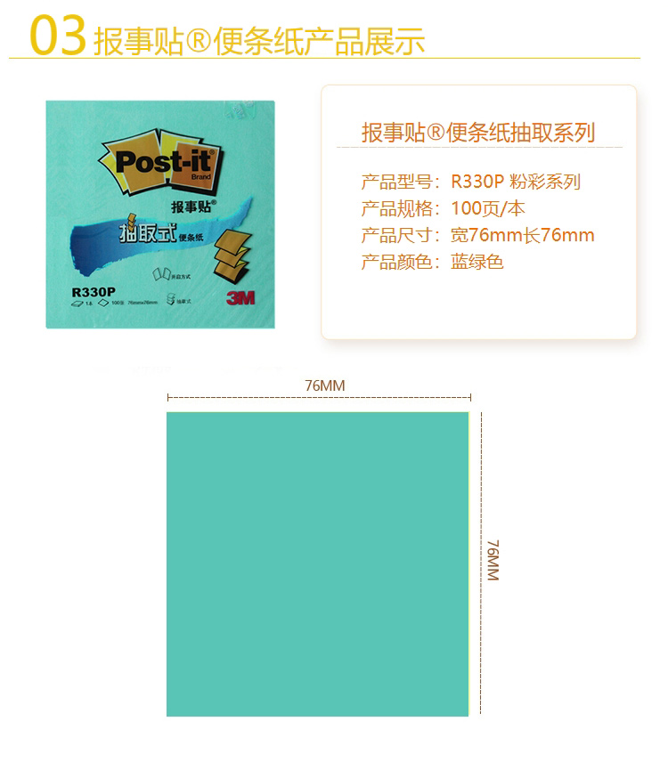 3M 抽取式报事贴 R330P 蓝绿色 76×76mm 100页 1本