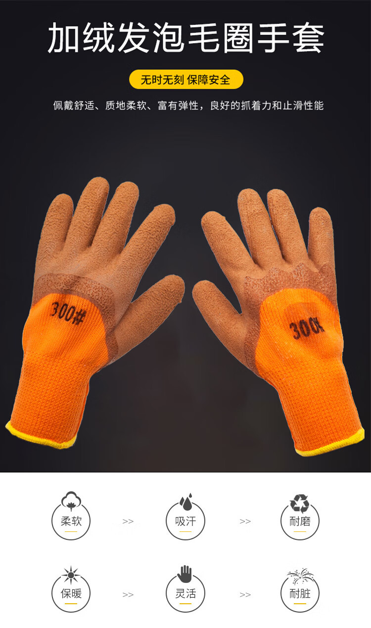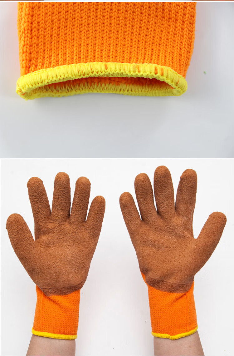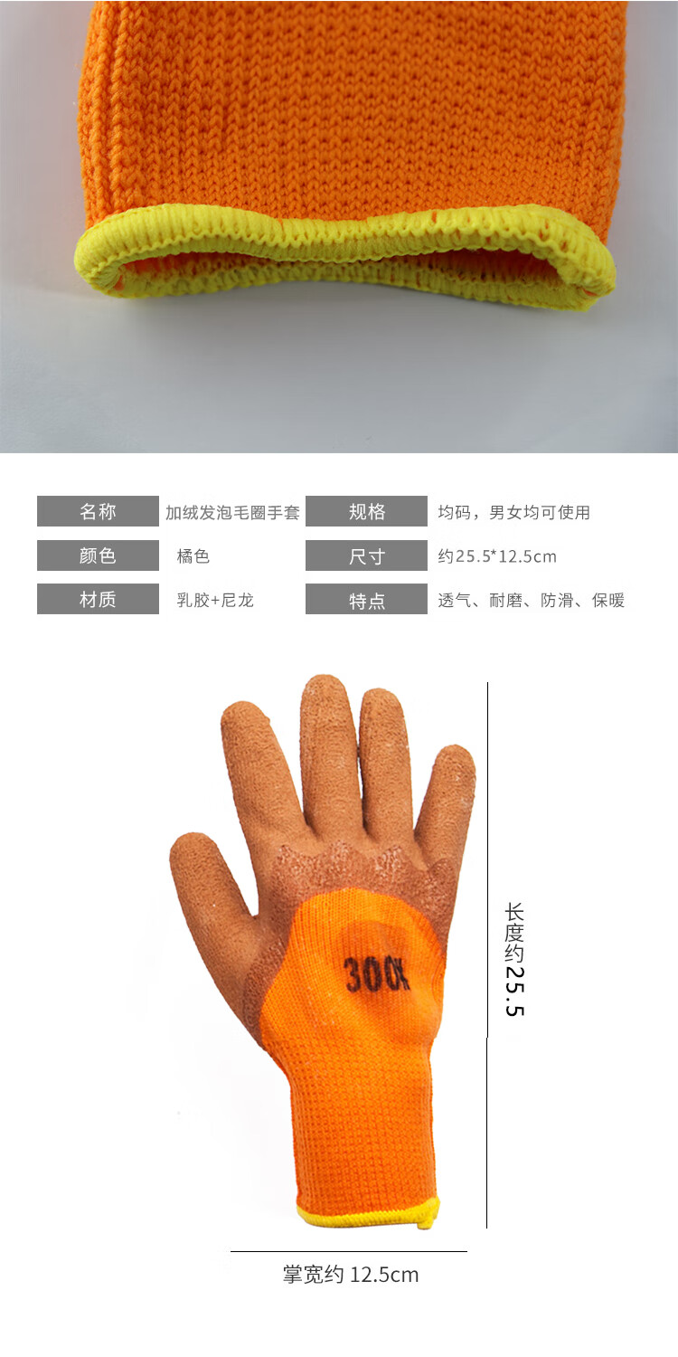 海斯迪克 加绒保暖发泡毛圈手套均码 KG70-2 橙色加强指 1双