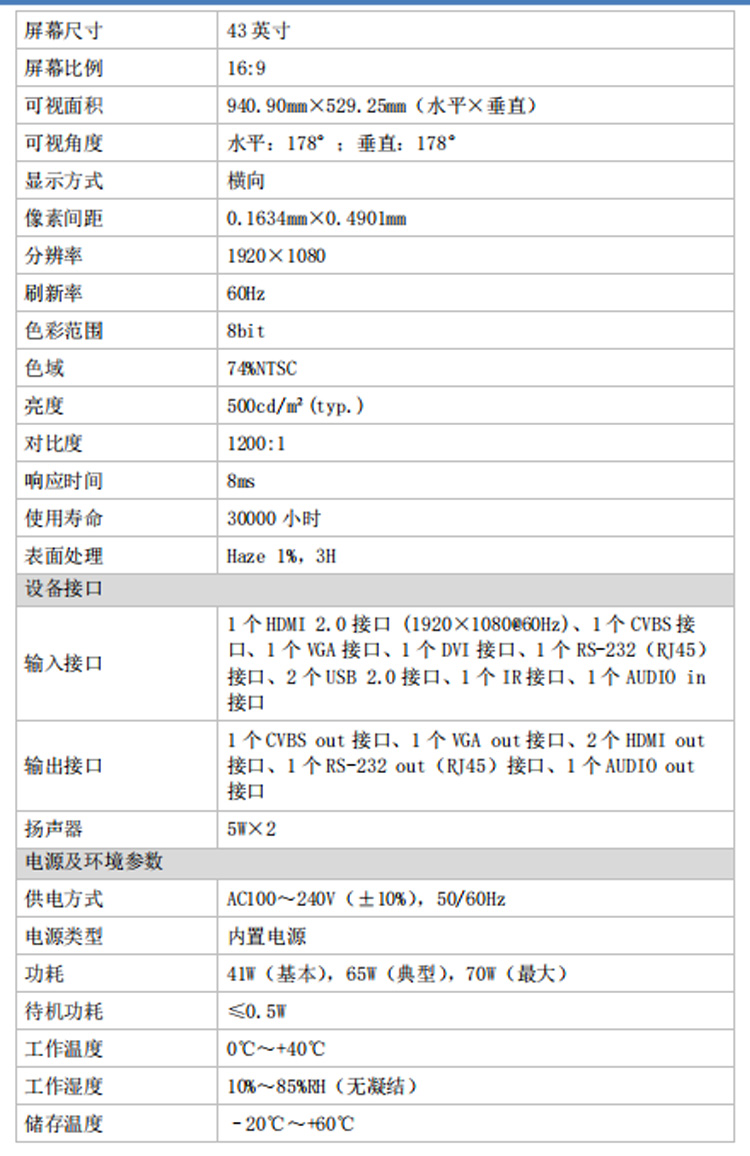大华 LED液晶监视器显示屏 DH-LM43-S200 43英寸 壁挂式 1台