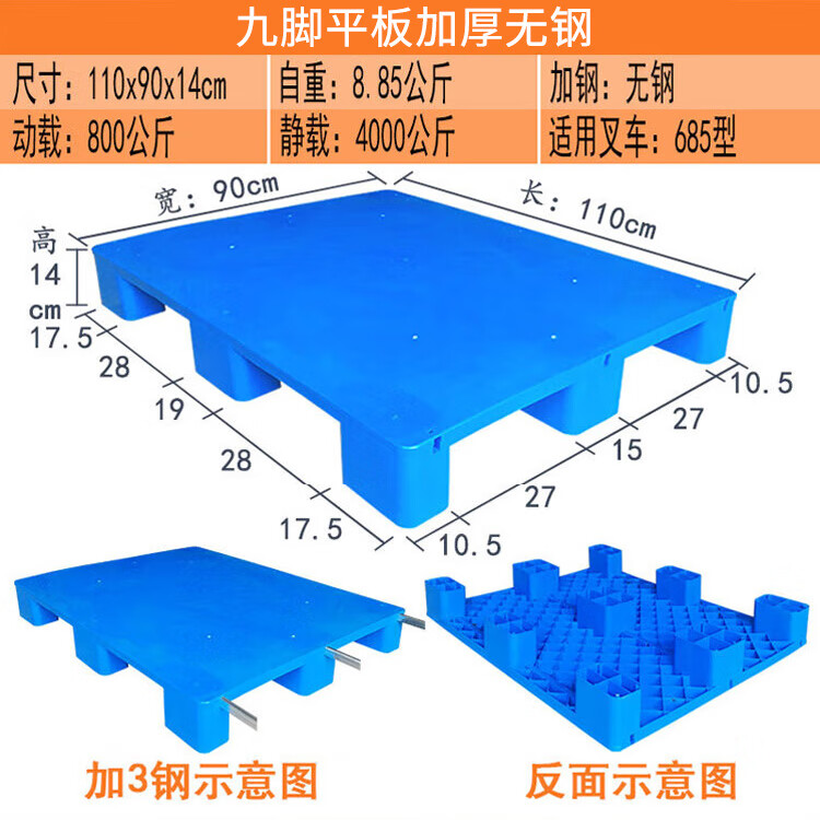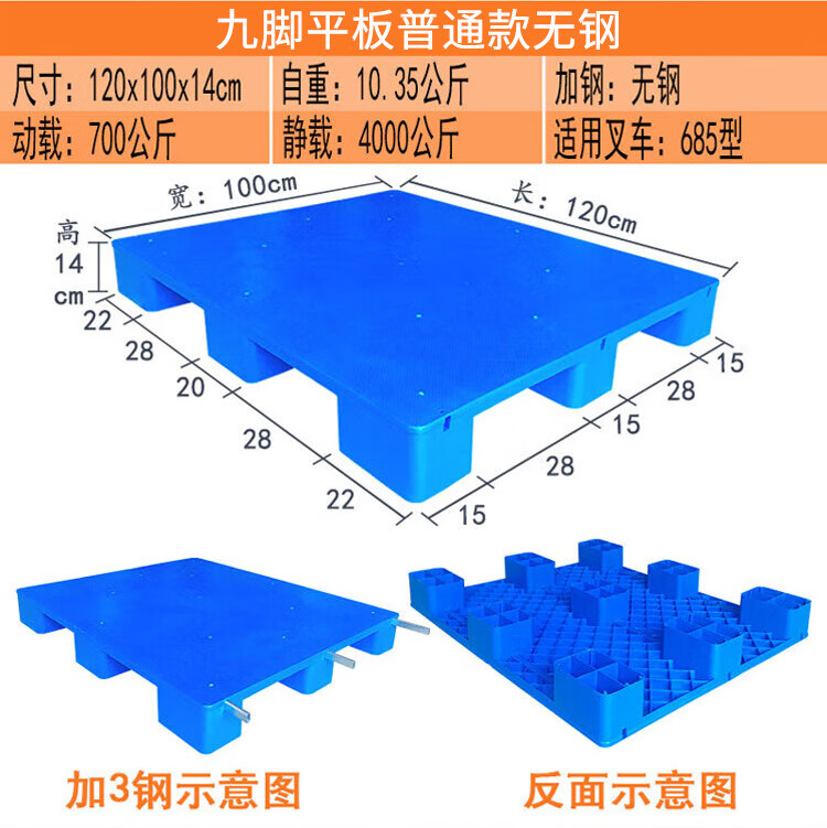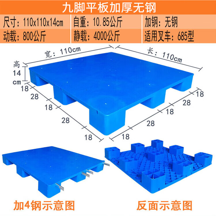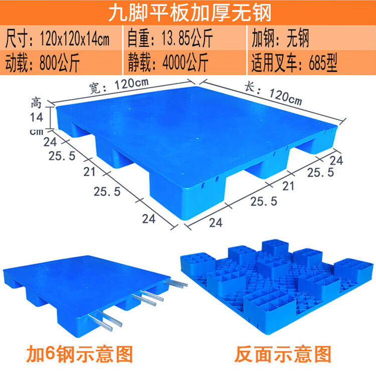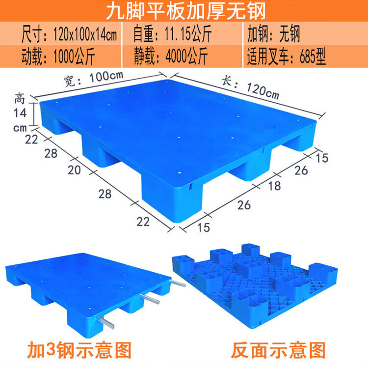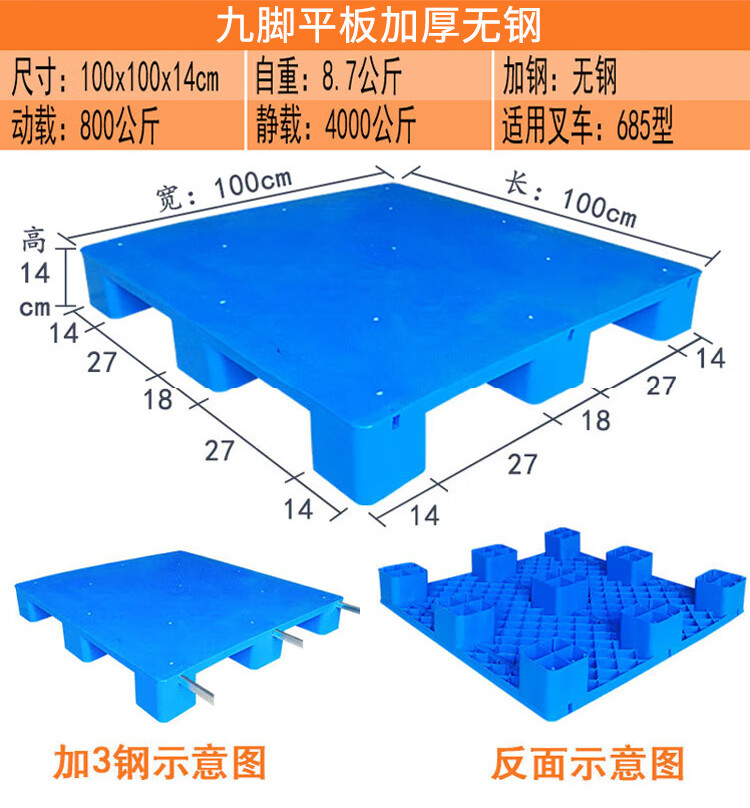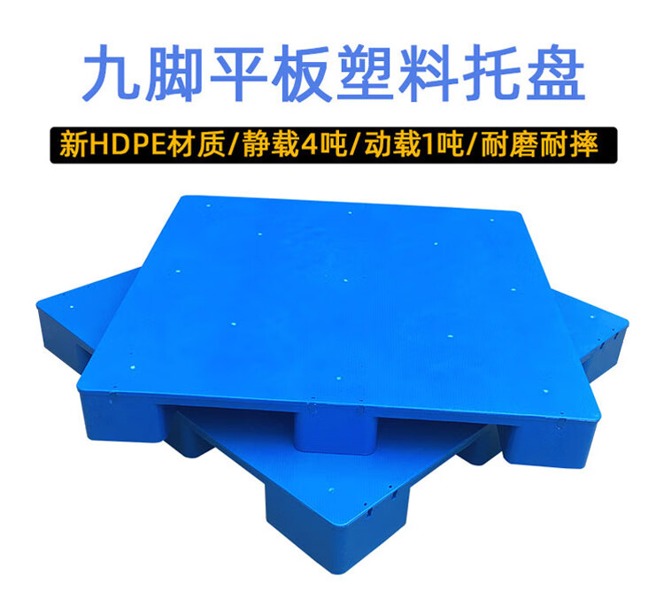 海斯迪克 九脚平板塑料托盘 KC114-6 蓝色 静载4T 动载0.8T 100*100*14cm 加3钢 1件