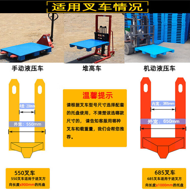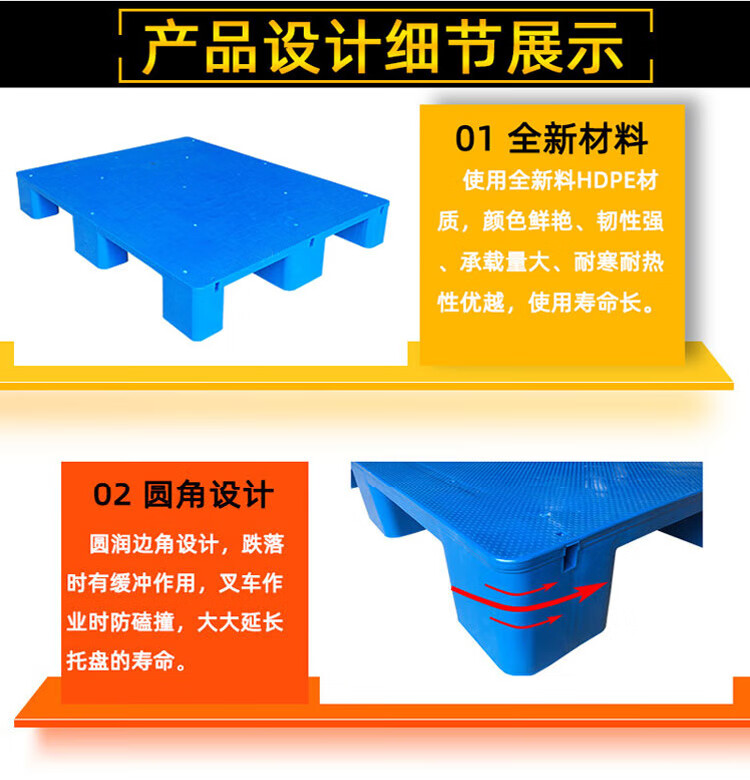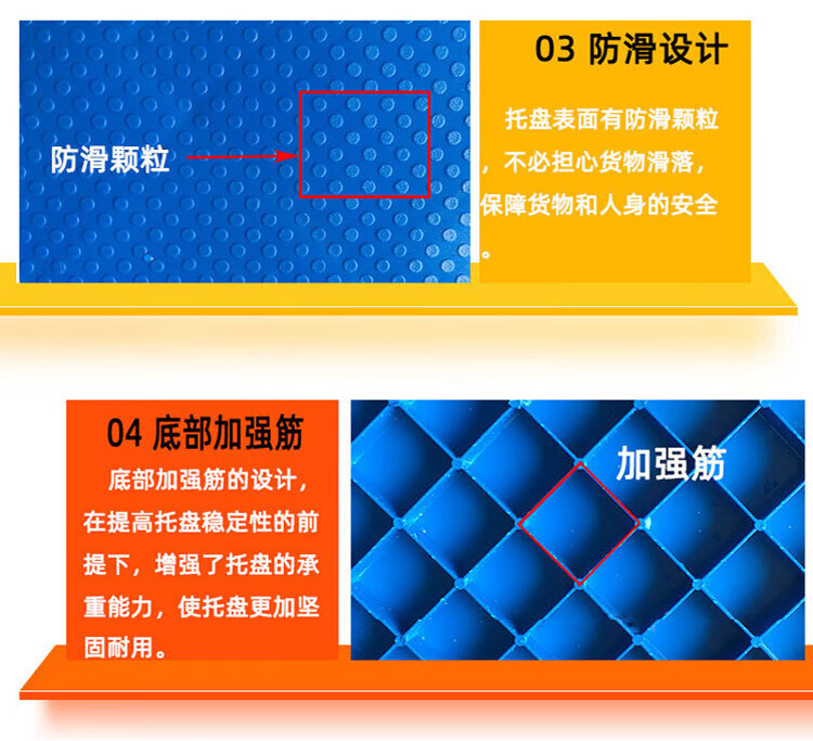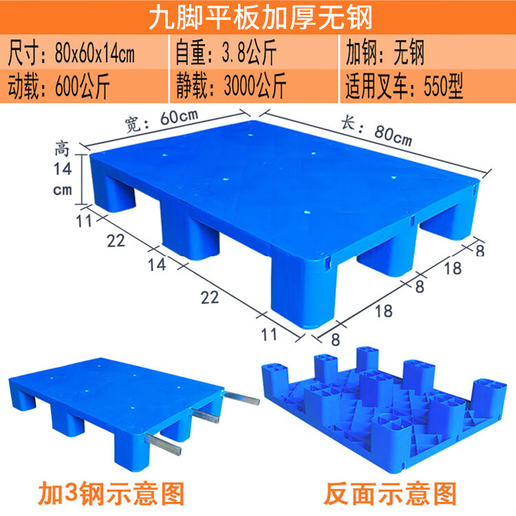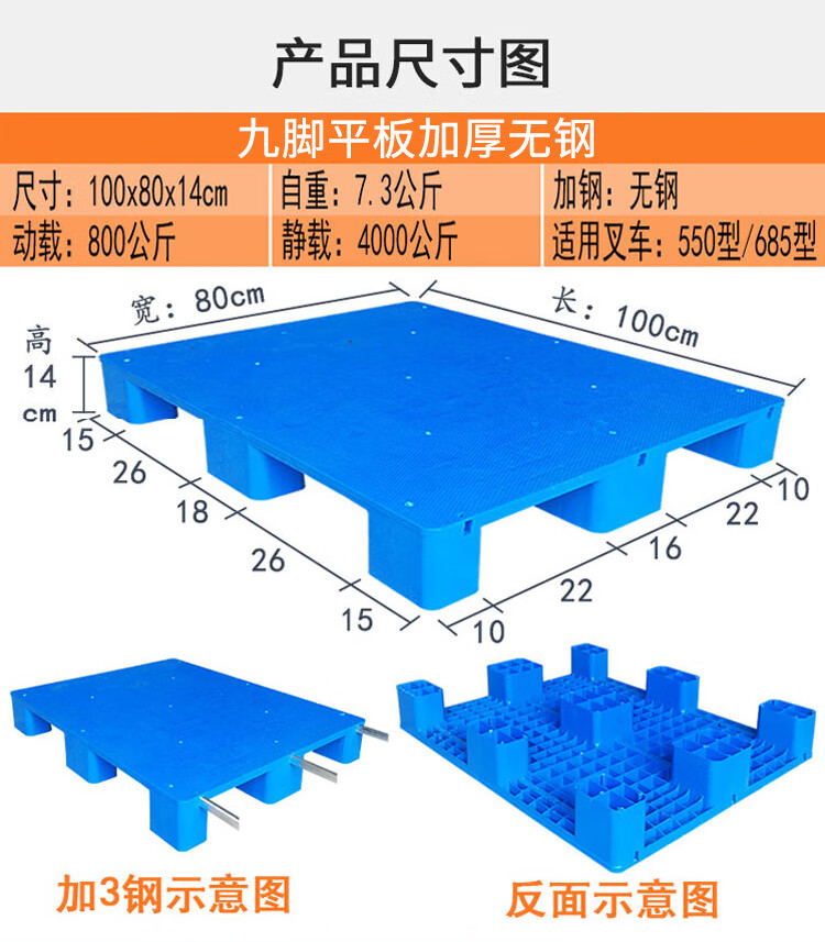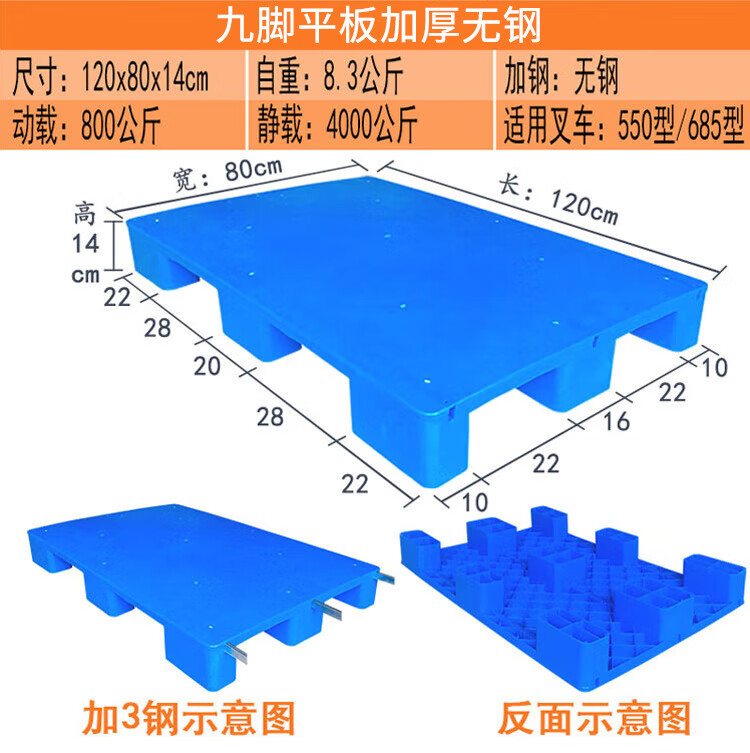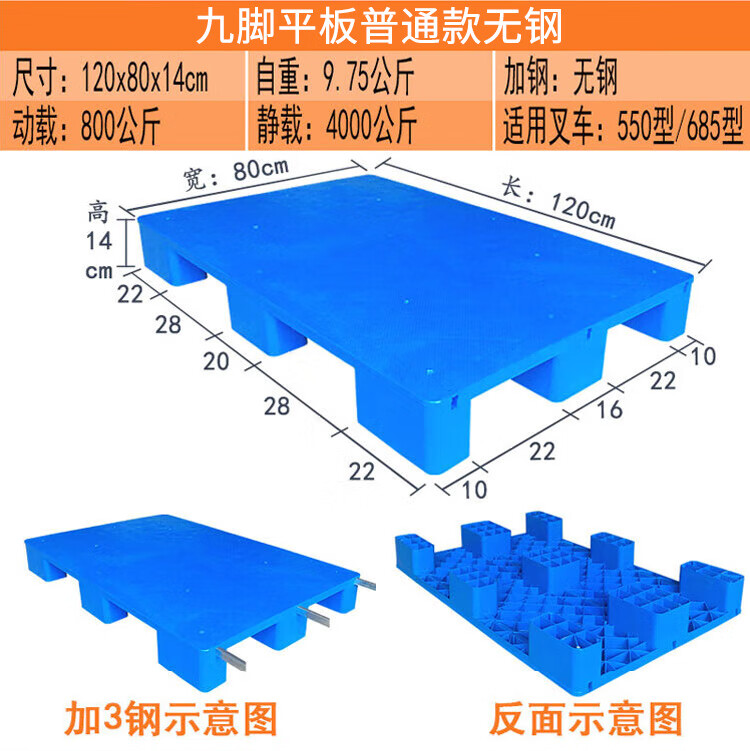 海斯迪克 九脚平板塑料托盘 KC114-6 蓝色 静载4T 动载0.8T 100*100*14cm 加3钢 1件