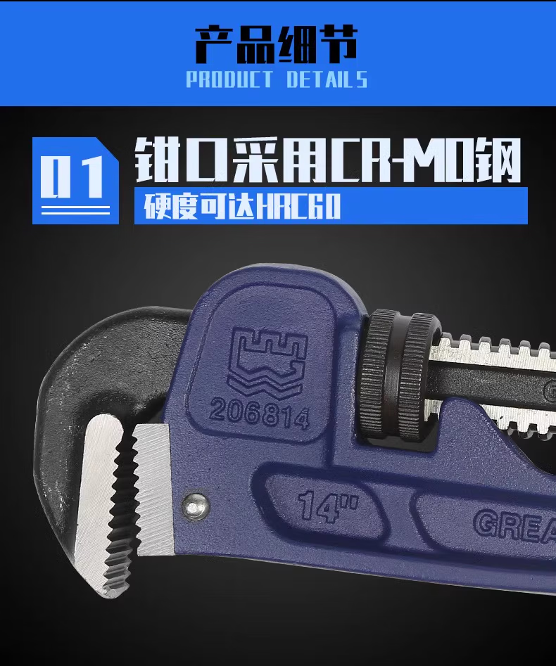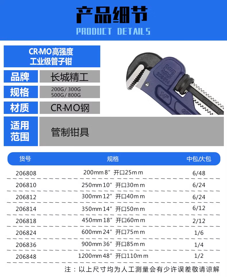 长城精工 工业级超重管子钳 206808 Cr-MO 8" 1把