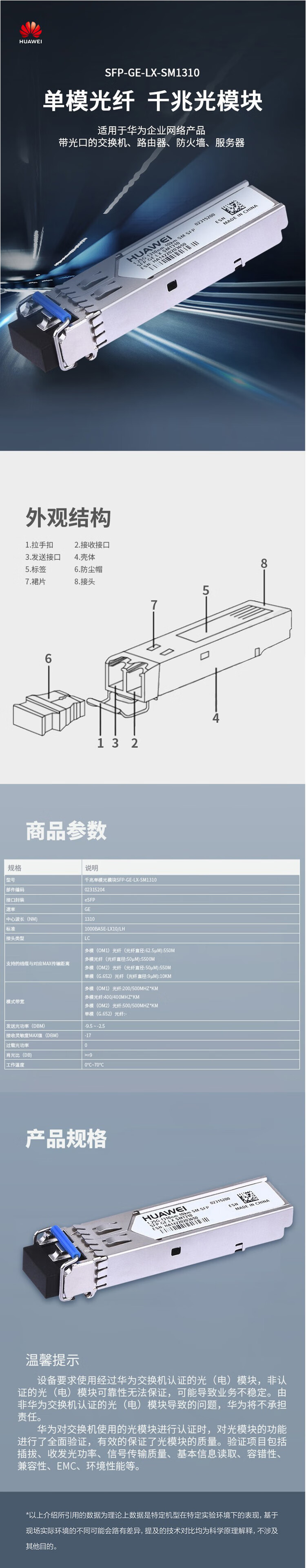 华为 千兆单模光模块 SFP-GE-LX-SM1310 波长1310nm 传输10km 1台