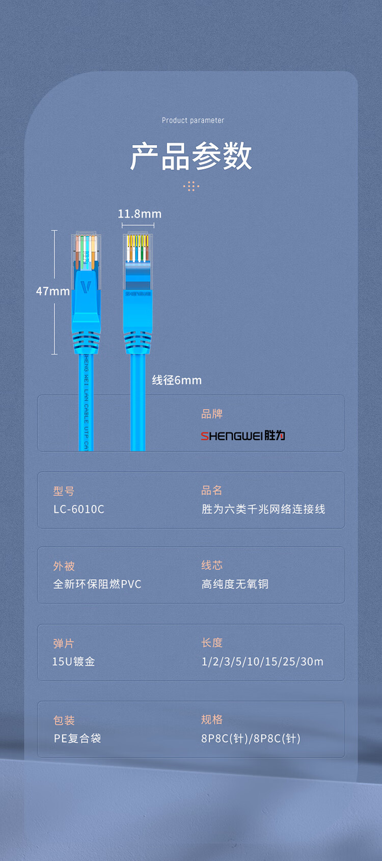 胜为 CAT6类千兆网线 LC-6020C 蓝色 2m 1条