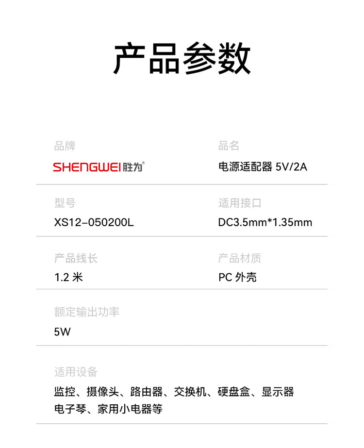 胜为 3C电源适配器 XS12-050200L DC3.5*1.35mm 2A 5V 1个