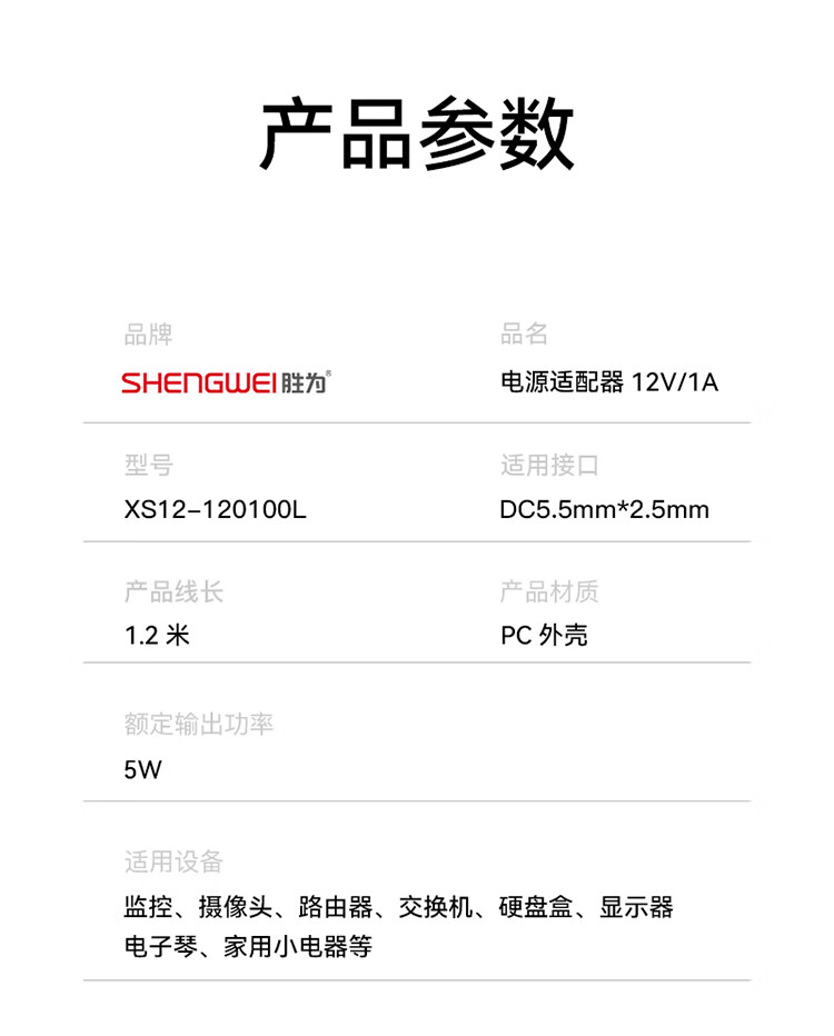 胜为 3C电源适配器 XS12-120100L DC5.5*2.5mm 1A 12V 1个