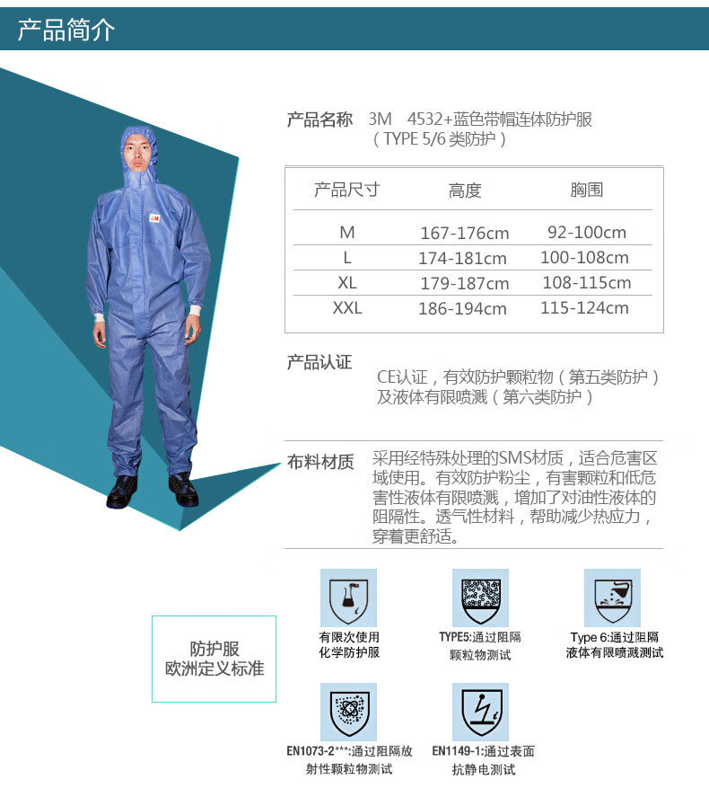 3M 带帽连体防护服 4532+ 蓝色 XXL 1套