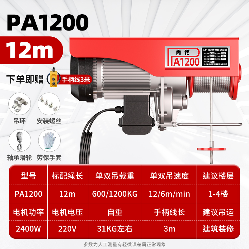 国产通用 微型电动葫芦 PA1200 载重:600-1200公斤 扬程:12米 1200*12线控 1个