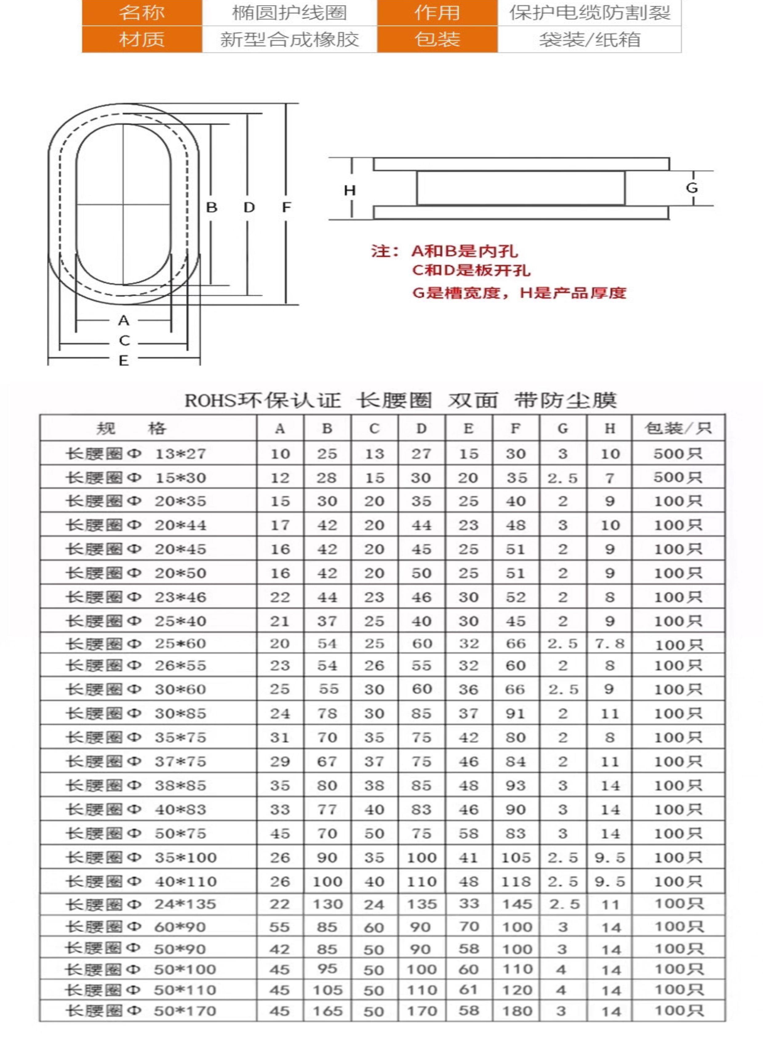 国产通用 椭圆形双面橡胶保护线套 开孔 50*100mm 1个