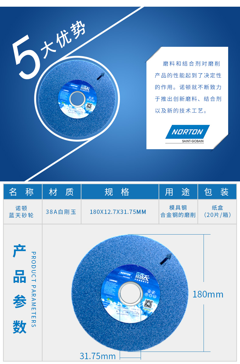 诺顿 砂轮 66253296172 白刚玉 180x12.7x31.75mm 1个