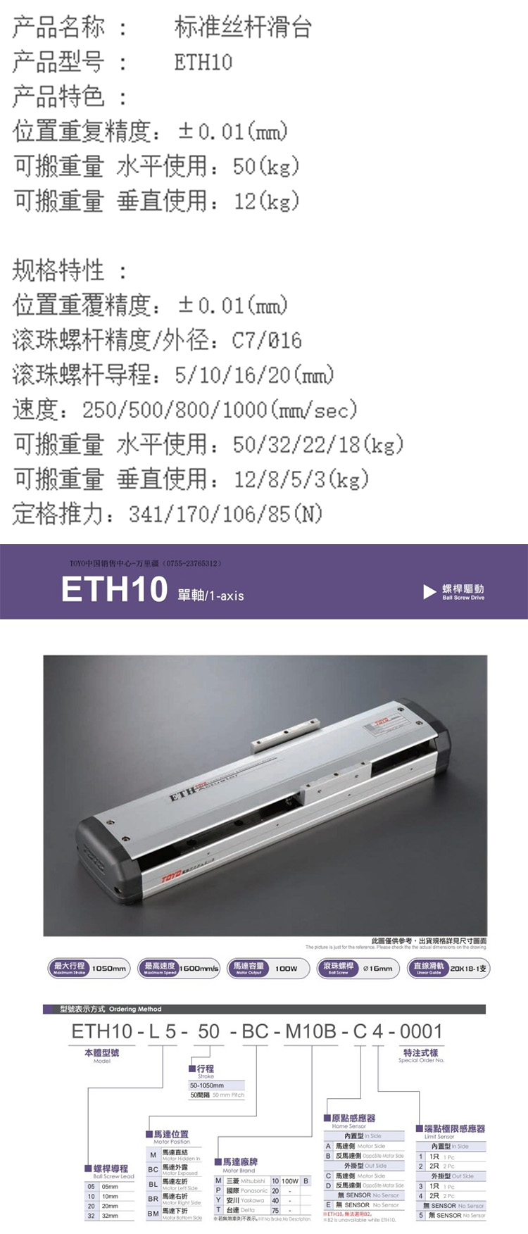 TOYO 标准丝杆滑台 ETH10-L10-300-BC-P20-E5 不含电机 1个
