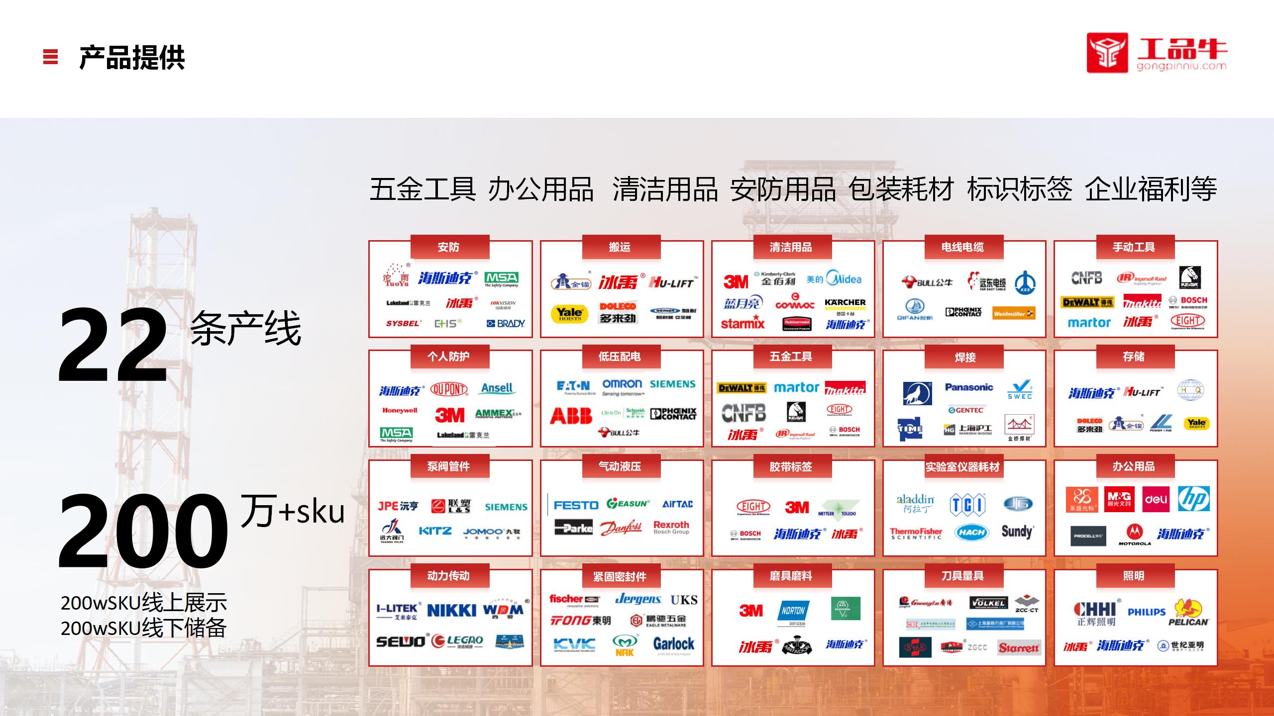工品牛提供五金工具、劳保、清洁、安防用品等20大类MRO产品,有200万+SKU。